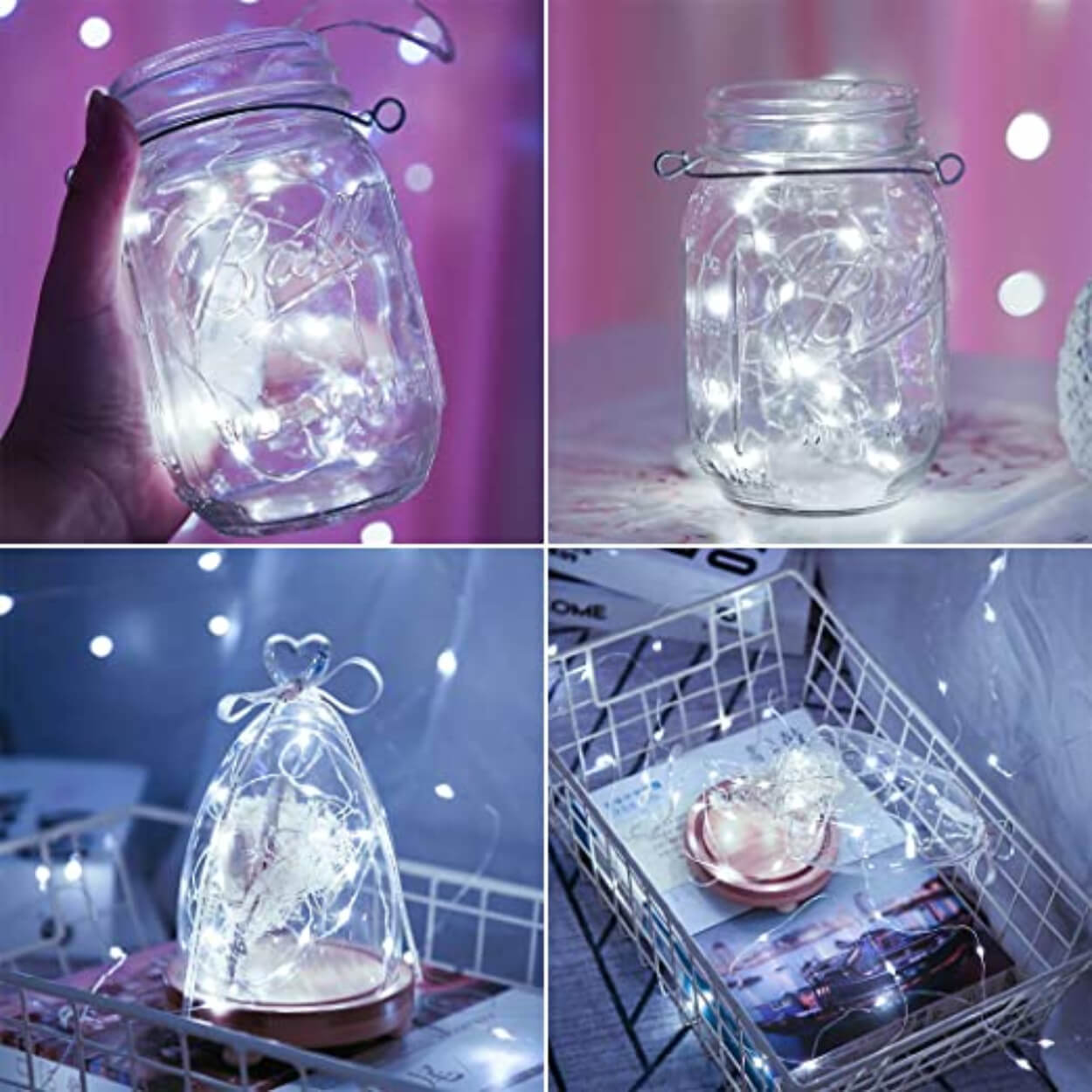 Mini LED-ljusslinga i 2-pack som ger flexibel dekorationsbelysning utan sladdar. Varje slinga är 1 meter lång och har 10 LED-lampor. Tre ljuslägen gör det enkelt att växla mellan fast sken och två blinkande lägen beroende på behov. Batteridrift med LR44 gör placeringen fri på hyllor, i fönster eller som bordsdekoration. Slingan är IP65-klassad för bättre tålighet mot damm och vattenstänk, medan batterilådan inte är IP-klassad. Batterier ingår.