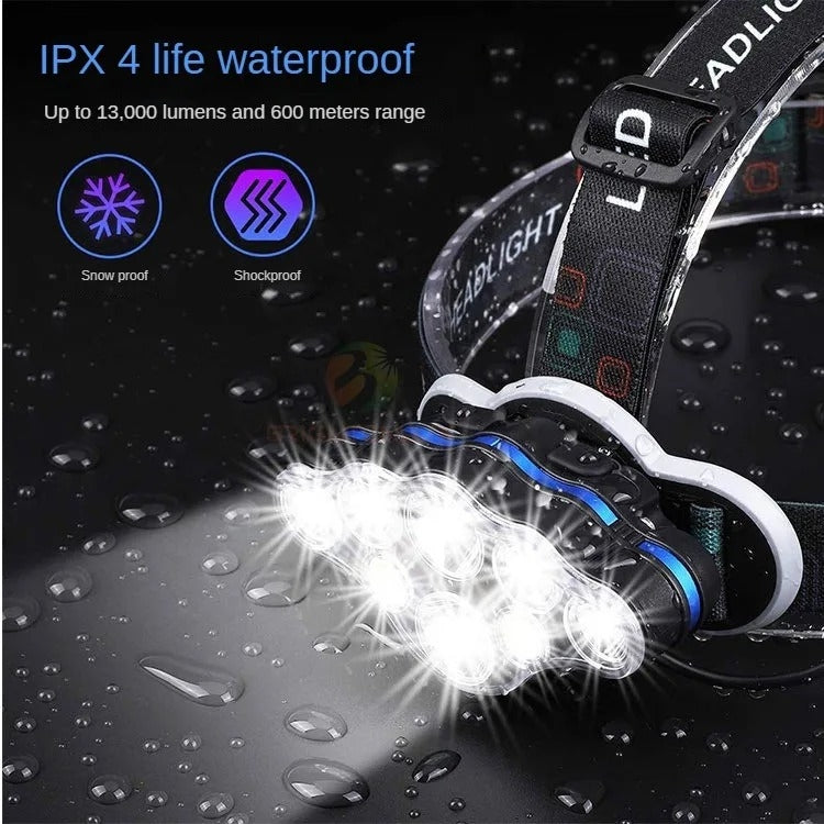 Led pannlampa / huvudlampa – friluftsliv, arbete – 8 LED, 40 000 lm, 25 W, USB