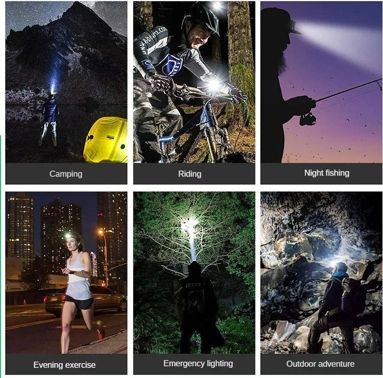 Uppladdningsbar LED-pannlampa för friluftsliv och arbete där du behöver starkt och riktat ljus. Åtta LED-ljuskällor ger upp till 40 000 lumen och en räckvidd på upp till 500 meter för sök, reparationer och orientering i mörker. Lamphuvudet kan vinklas 90° så att ljuset hamnar där du arbetar utan att du behöver ändra huvudposition. Konstruktionen i ABS-plast är vattentät och stötsäker för användning i krävande miljö. Laddning sker via USB och två batterier medföljer, tillsammans med förvaringsväska och kabel.