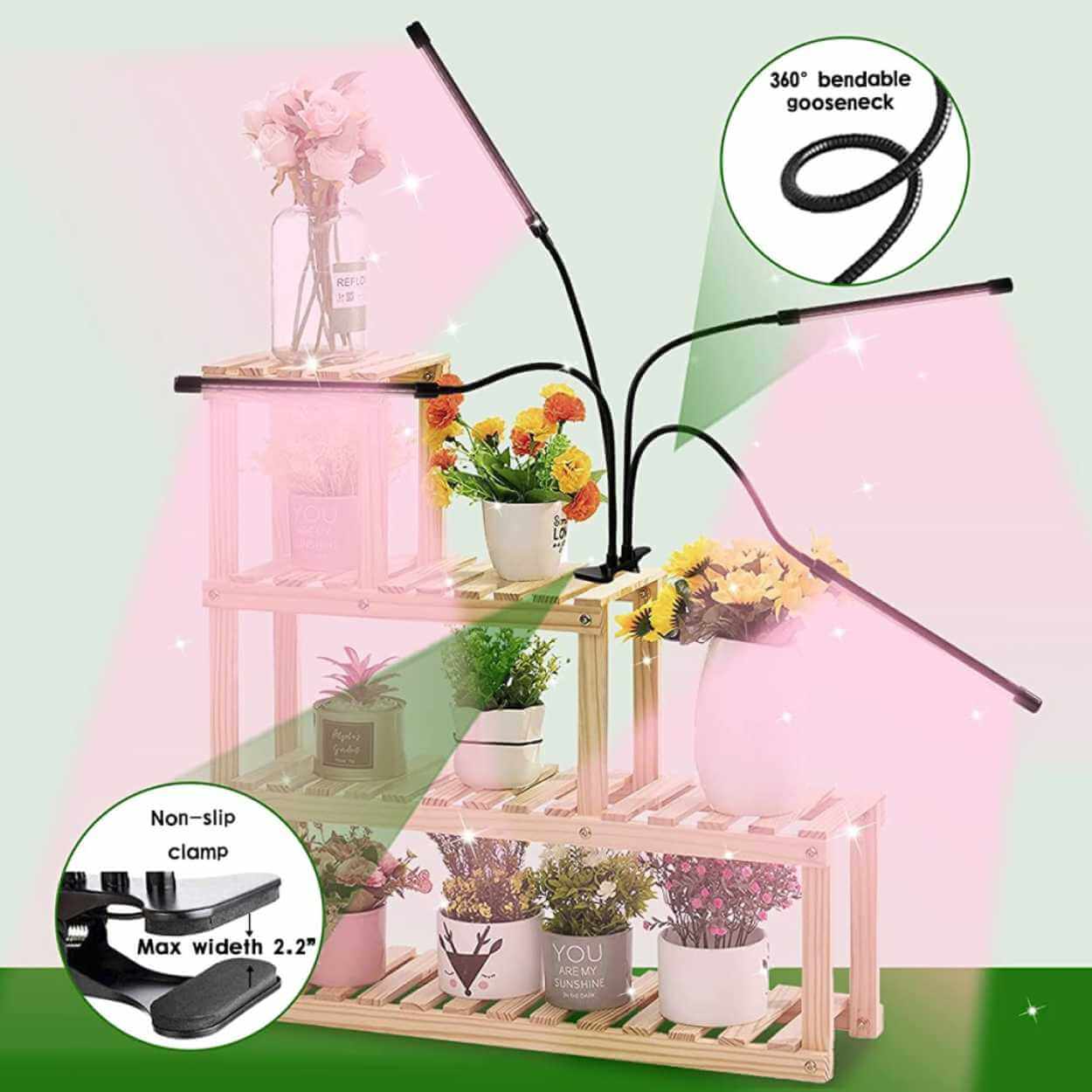 LED-växtlampa med klämma som ger riktat tillskottsljus för inomhusodling. Två flexibla armar gör det enkelt att placera ljuset över frösådder, sticklingar och krukväxter, även när naturligt fönsterljus bara kommer från ett håll. Lampan har 3 ljuslägen och dimmer så intensiteten kan anpassas efter växtens fas. Inbyggd timer stänger av automatiskt efter 3, 6 eller 12 timmar för en jämn ljuscykel. Drivs via USB och monteras snabbt på hyllor och fönsterbrädor.