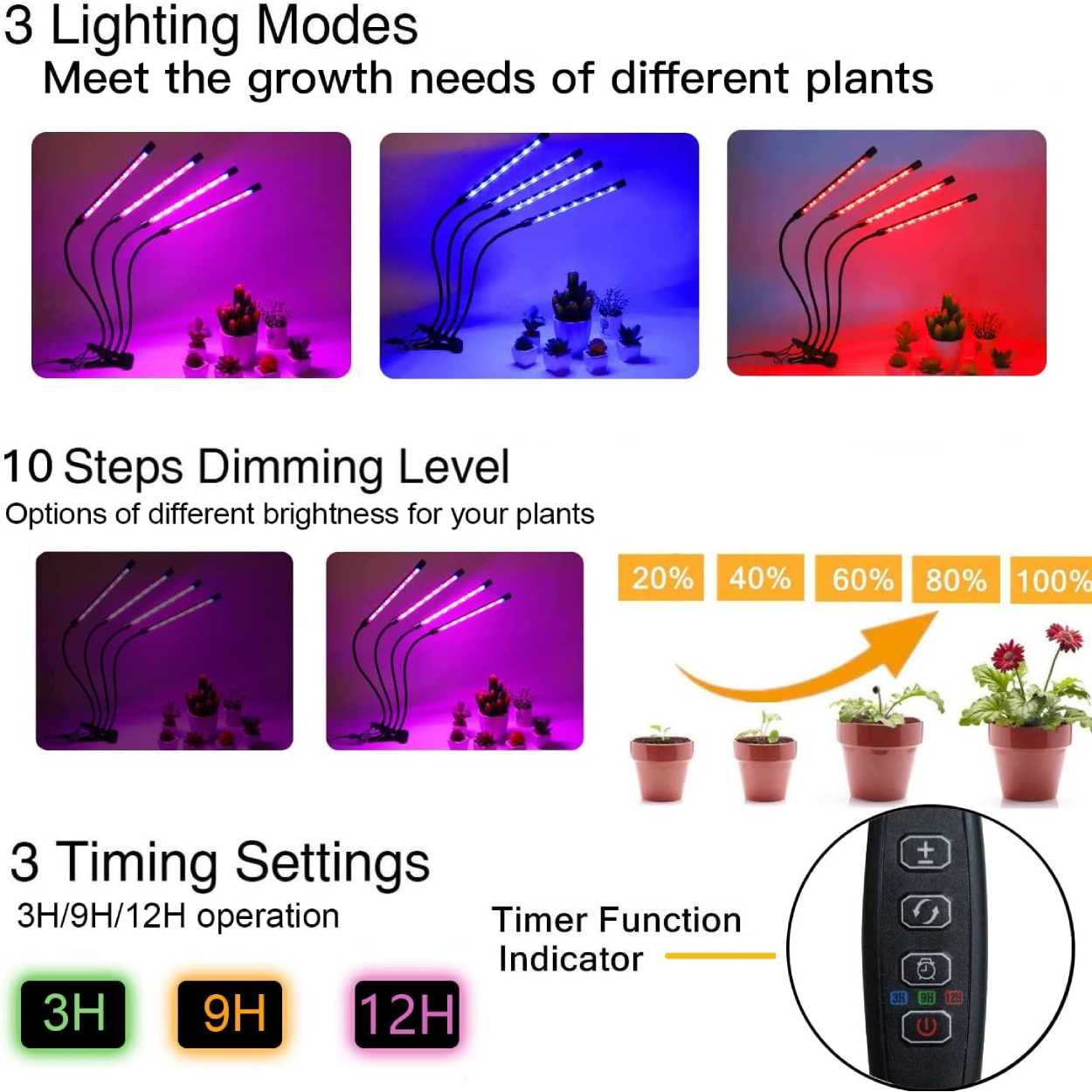 Timerfunktionen förenklar daglig användning när lampan används som tillskottsbelysning under mörkare perioder. De flexibla armarna gör det möjligt att ge sidoljus för jämnare tillväxt och minska att plantor lutar mot fönstret. USB-drift gör lampan enkel att ansluta till USB-adapter, dator eller powerbank vid behov.