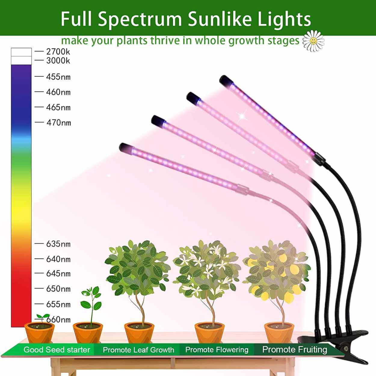 LED växtlampa / växtbelysning – frösådd, sticklingar – fullspektrum, USB, timer 3/6/12 h