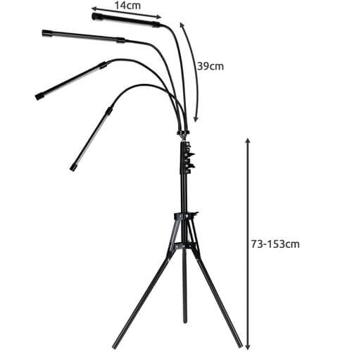 LED växtlampa med stativ och fyra justerbara armar som gör det enkelt att rikta ljuset mot flera plantor samtidigt. Lampan drivs via USB och har tre belysningslägen samt timer i 4, 8 eller 12 timmar för en jämn ljuscykel. Ljuset kombinerar rött 660 nm och blått 460 nm för att stödja fotosyntesen vid förodling, tillväxt och blomning. IP54-klassning ger extra tålighet i fuktigare odlingsmiljöer. Stativet kan höjdjusteras för att följa plantornas utveckling.