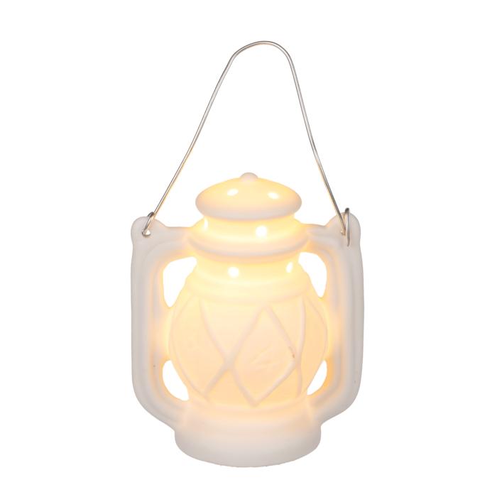 LED-lykta i keramik som ger ett varmt vitt sken när den tänds. Konstruktionen gör att lyktan kan användas både som hängande dekoration och som fristående ljuslykta på en plan yta. Batteridriften gör placeringen enkel utan behov av sladd eller uttag, vilket passar i rum där du vill skapa mjuk stämningsbelysning. Batterier ingår så att lyktan kan tas i bruk direkt.