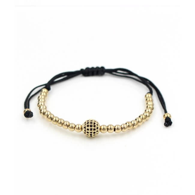 Makraméarmband med pläterade kopparkulor som ger ett rent och balanserat uttryck på handleden. Det vävda bandet sitter följsamt och fungerar bra att bära ensamt eller tillsammans med klocka och andra armband. Kulorna är 4 mm för en diskret profil, medan en 8 mm accentkula i mitten skapar en tydlig mittpunkt. Den låga vikten gör armbandet bekvämt vid lång användning och passar för vardagligt bruk när du vill addera en enkel detalj.