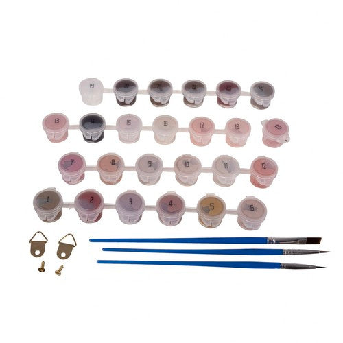 Måla efter nummer-set med kattmotiv som gör det enkelt att skapa en färdig tavla, även utan tidigare erfarenhet. Duken är förtryckt med numrerade fält och redan uppspänd på träram, så arbetet kan starta direkt. Setet innehåller färgsats och tre penslar för olika detaljer, samt bildprov som stöd under målningen. För upphängning medföljer både krokar med skruvar och spårlösa krokar. Passar som lugnt pyssel hemma och ger ett tydligt resultat när varje fält fylls i.