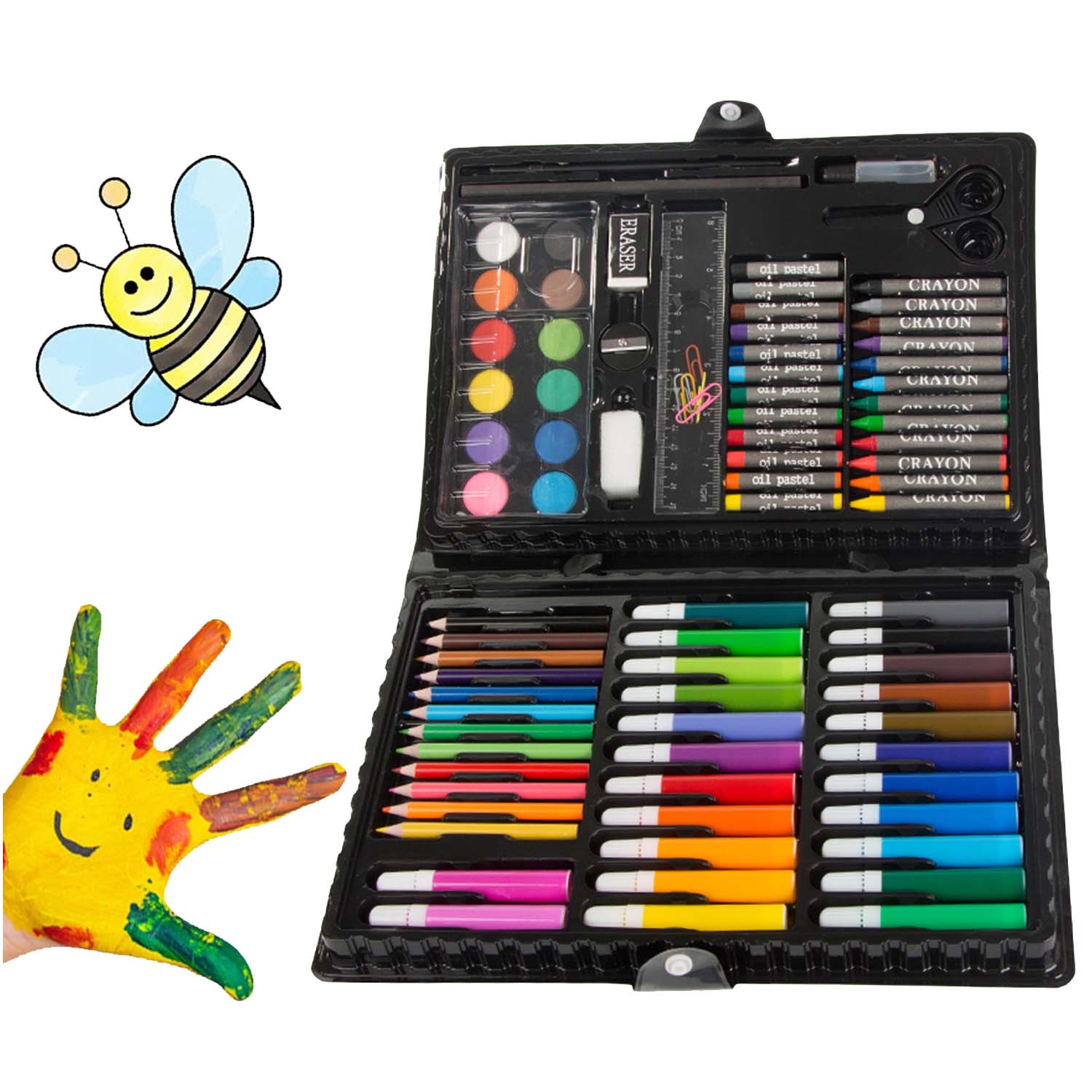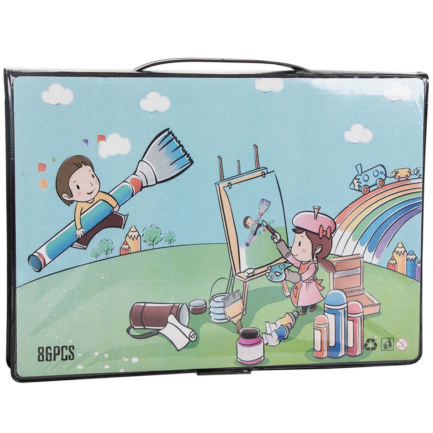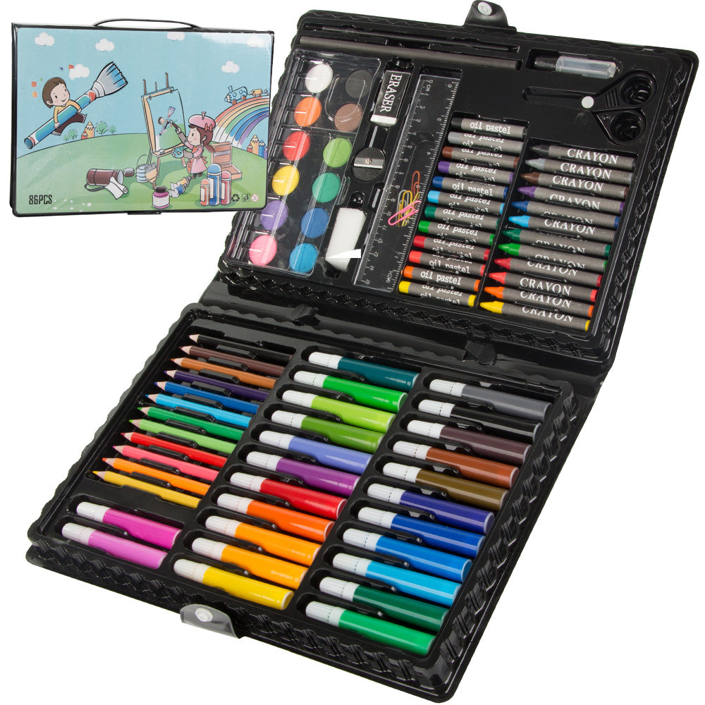 Målarset med 86 delar som samlar flera tekniker i en och samma väska. Setet innehåller vaxkritor, oljepasteller, fiberpennor, färgpennor och vattenfärger, samt praktiska tillbehör som pensel, palett, pennvässare, blyertspenna, suddgummi, lim, pappersklämmor och linjal. Plastväskan med bärhandtag gör det enkelt att ta med till skola, resa eller pysselbordet hemma och håller allt organiserat så att rätt verktyg snabbt finns till hands.
