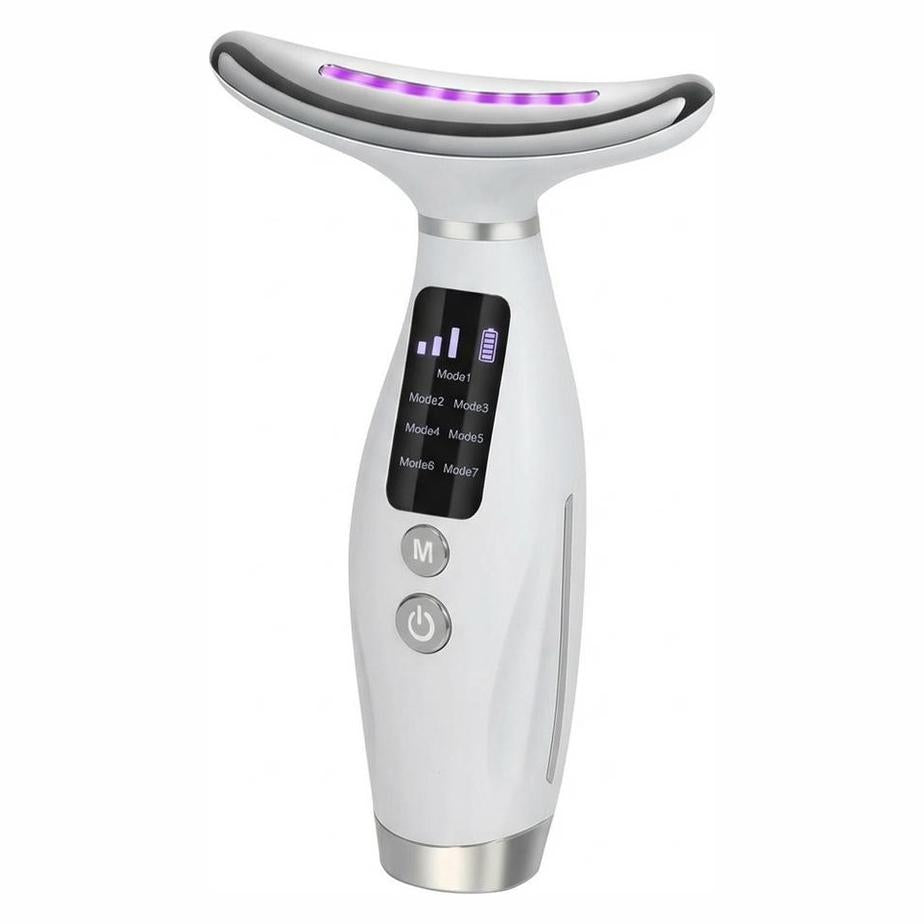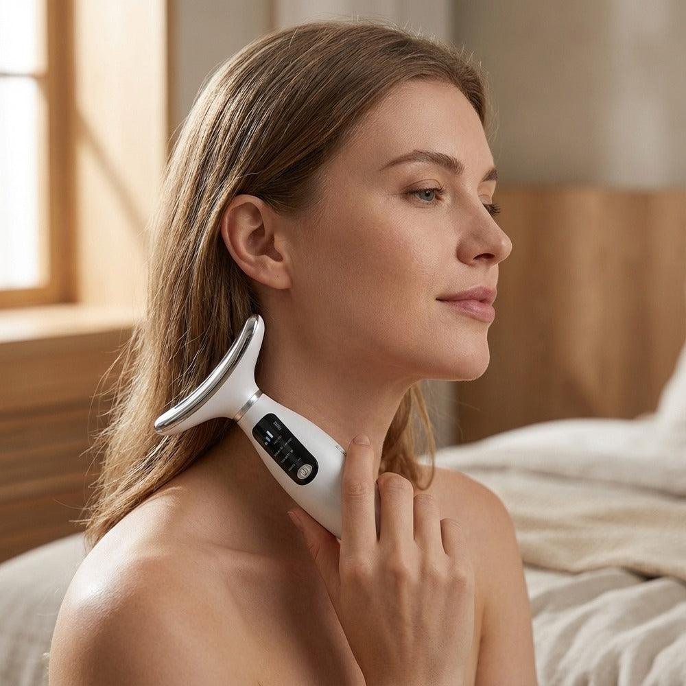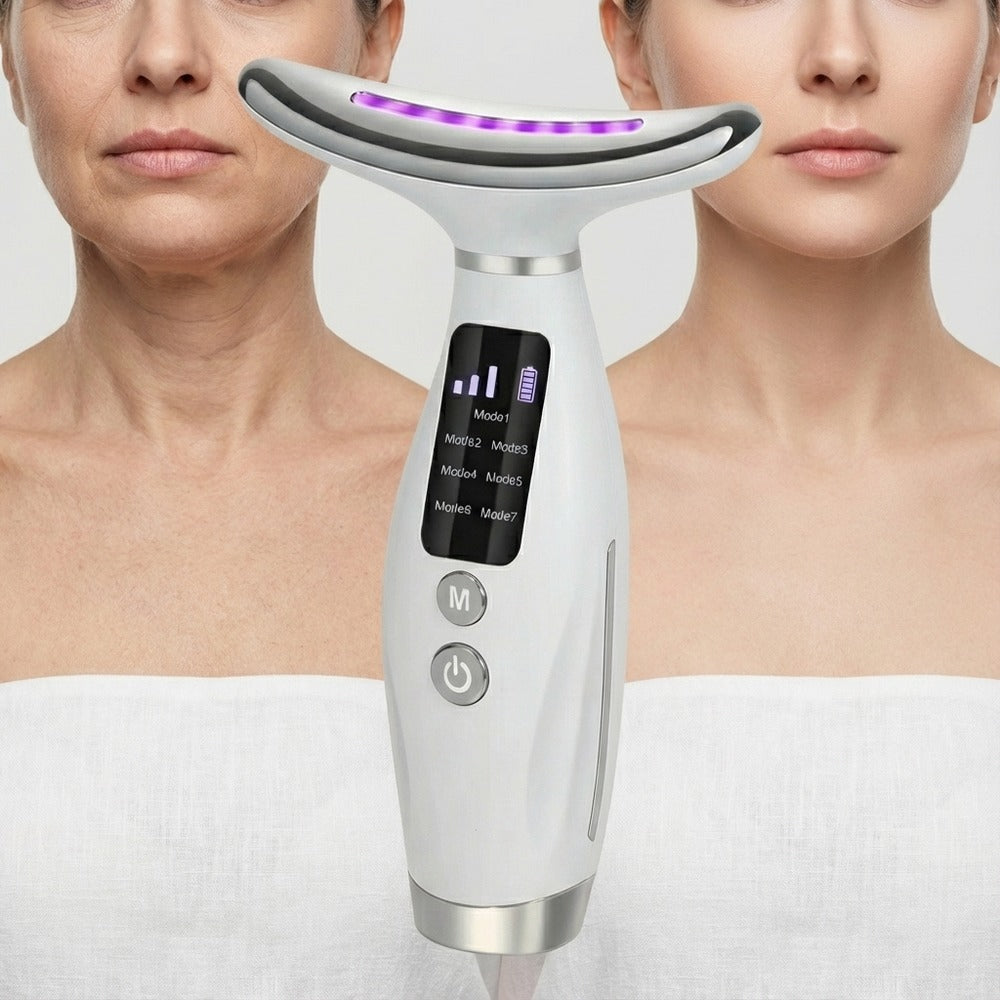 Mikroström hals- och ansiktsmassageapparat för hemmabruk som kombinerar tre lägen: rengöring, mikroström och uppvärmd vibrationsmassage. Det konturanpassade behandlingshuvudet är gjort för att följa hals och käklinje i svepande rörelser. Värmeläget når upp till 45°C och ger en behaglig känsla vid massage. Enheten har angiven vibrationsfrekvens på 6200–9500 gånger per minut beroende på läge. Passar i en daglig hudvårdsrutin och kan användas på hals samt utvalda partier i ansiktet.
