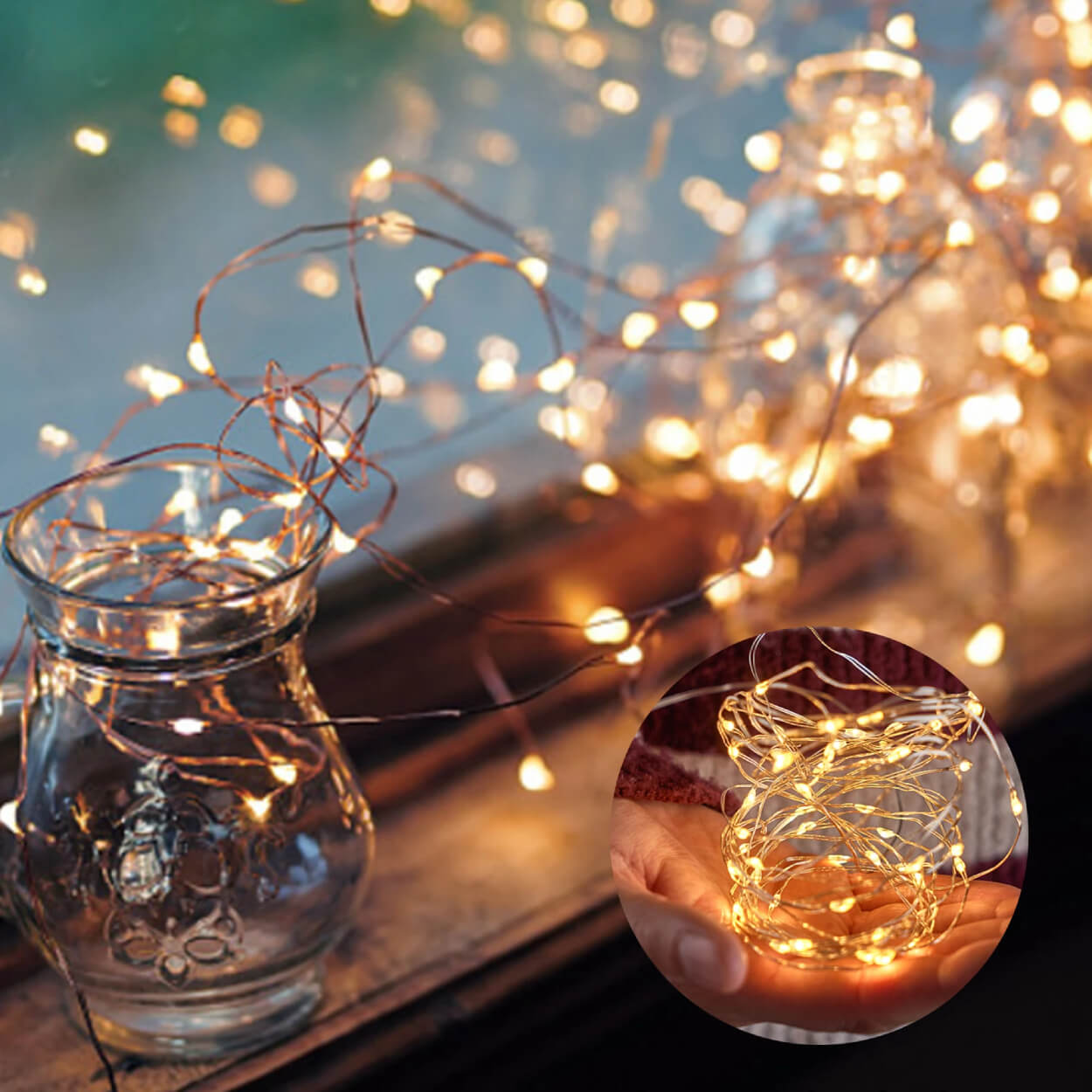 Mini LED-ljusslinga för dekorationsbelysning i mindre miljöer, som spegel, tavla eller blomkruka. Varje slinga är 1 meter lång och har 10 LED som ger ett mjukt och behagligt sken. Batteridriften gör placeringen flexibel utan sladdar eller eluttag. Själva slingan är IP65-klassad för användning där fukt kan förekomma, medan batterilådan inte är IP-klassad. Levereras som 2 slingor och drivs av CR2032-batterier som ingår, vilket gör den enkel att ta i bruk direkt.
