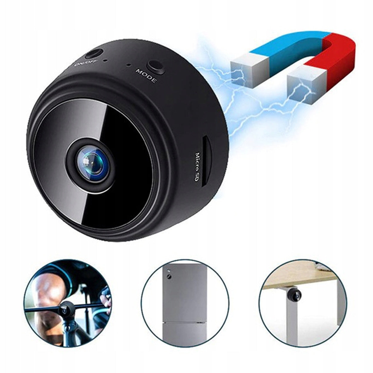 För lokal lagring används microSD-kort (minneskort ingår inte). Kameran kan placeras på metallytor via magneten eller monteras med medföljande fäste. Uppladdningsbart batteri gör den användbar även där fast ström saknas.