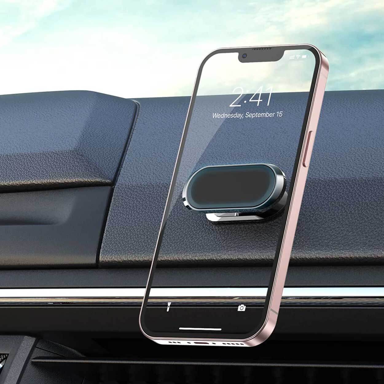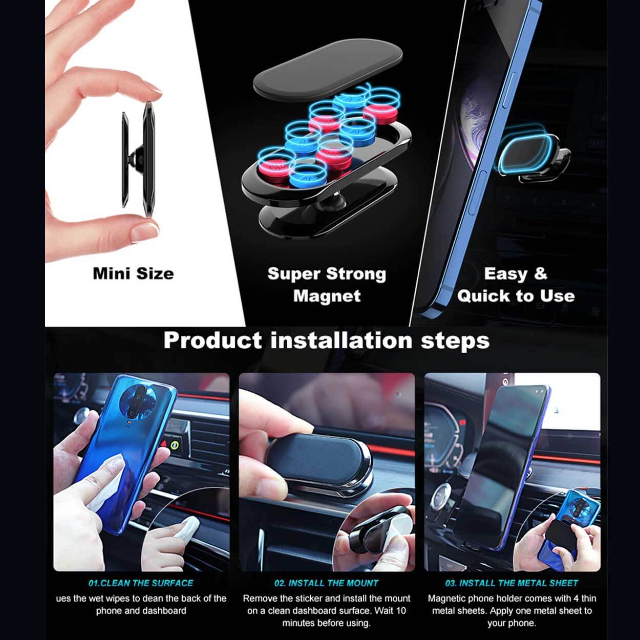 Magnetisk mobilhållare för bil som ger snabb och stabil placering av telefonen vid körning. Hållaren monteras på släta ytor med 3M självhäftande baksida och kan roteras 360° för att ställa in rätt vinkel för navigation eller handsfree-samtal. Två magnetplattor ingår och kan fästas på mobilen eller på ett mobilskal, vilket gör hållaren kompatibel med de flesta smartphones. Passar även föremål som redan är magnetiska och gör det enkelt att ta av och sätta dit enheten med en hand.