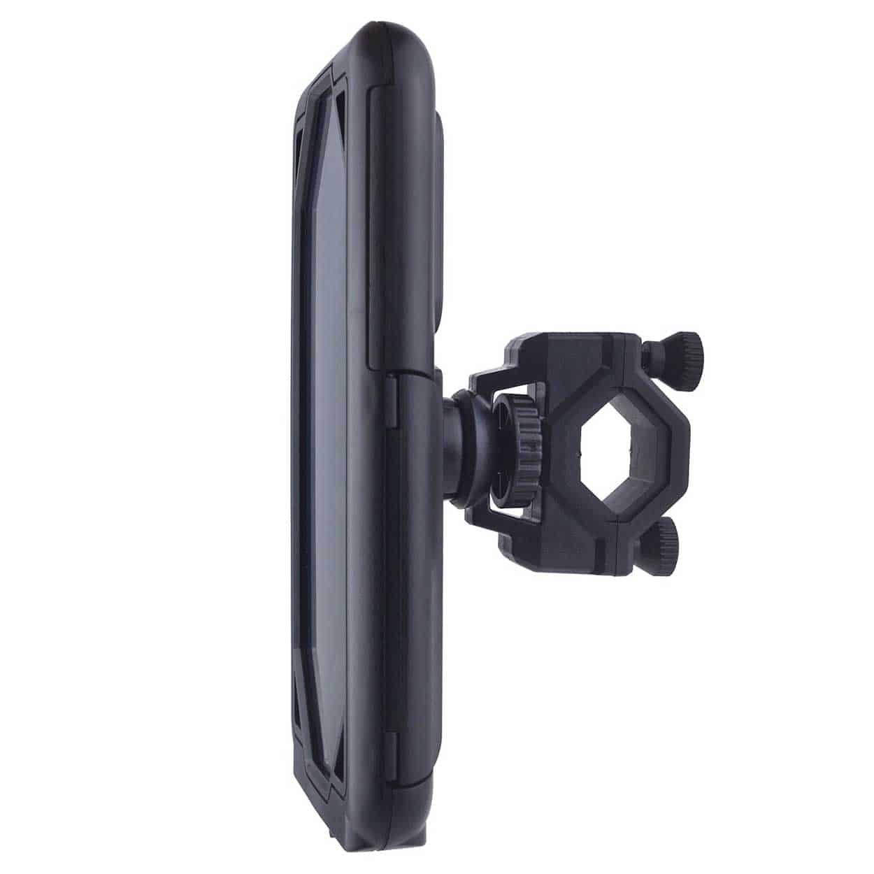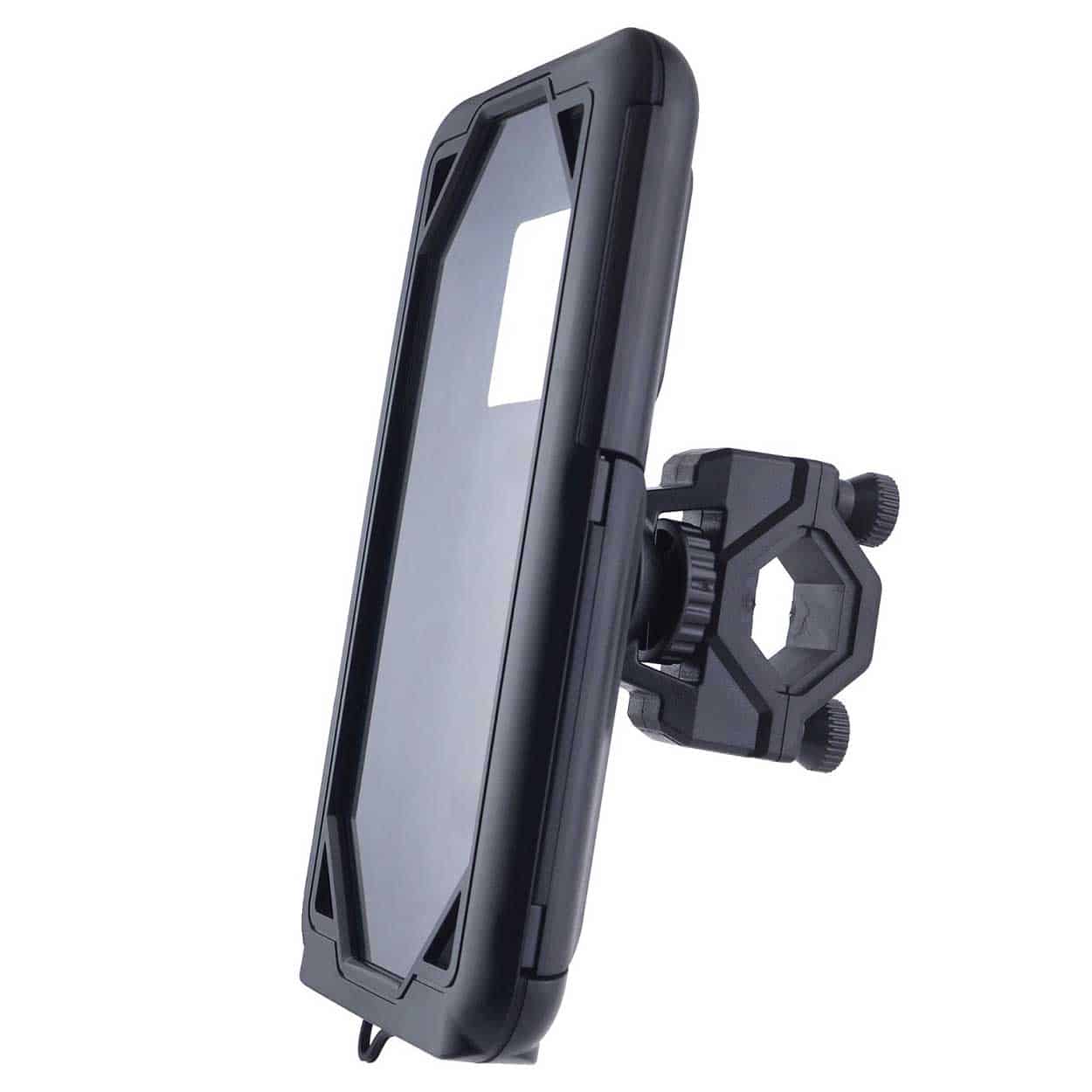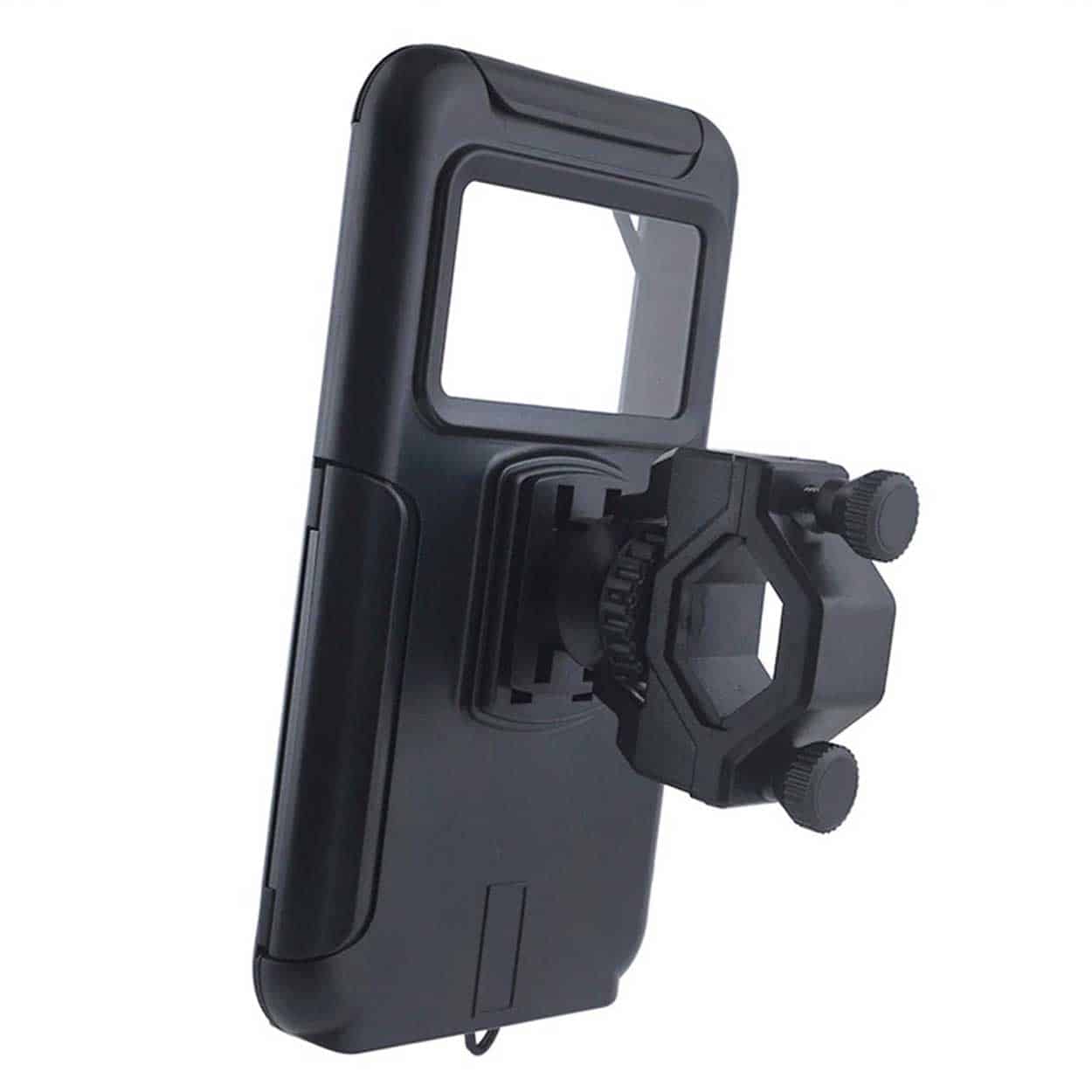 Vattentät mobilhållare för cykel som kombinerar styrefäste och skyddande cykelväska för telefoner 5,5–7,4 tum. Fodralet skyddar mot regn, snö, sand, lera och smuts samtidigt som touchfunktionen gör att GPS och appar kan användas utan att ta ut mobilen. Hållaren kan roteras 360 grader för liggande eller stående visning. Kamerahål gör det möjligt att filma när mobilen sitter i fodralet. Öppning för laddkabel finns, men skyddet minskar om den lämnas öppen. Avsedd för väta, inte nedsänkning.
