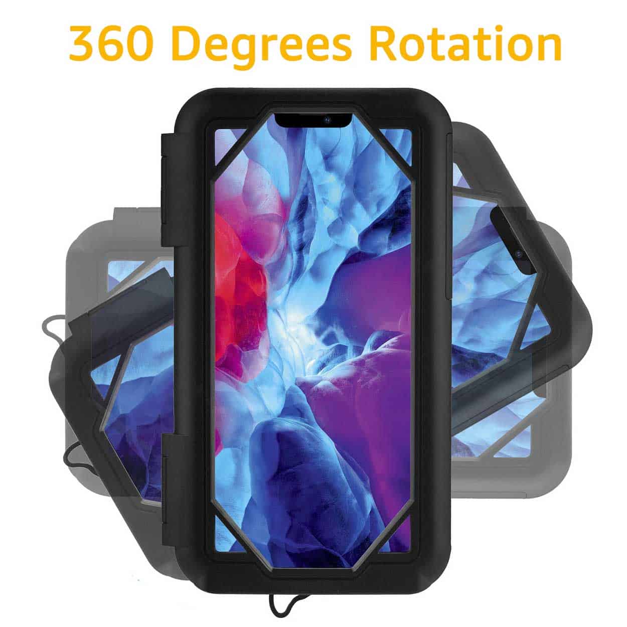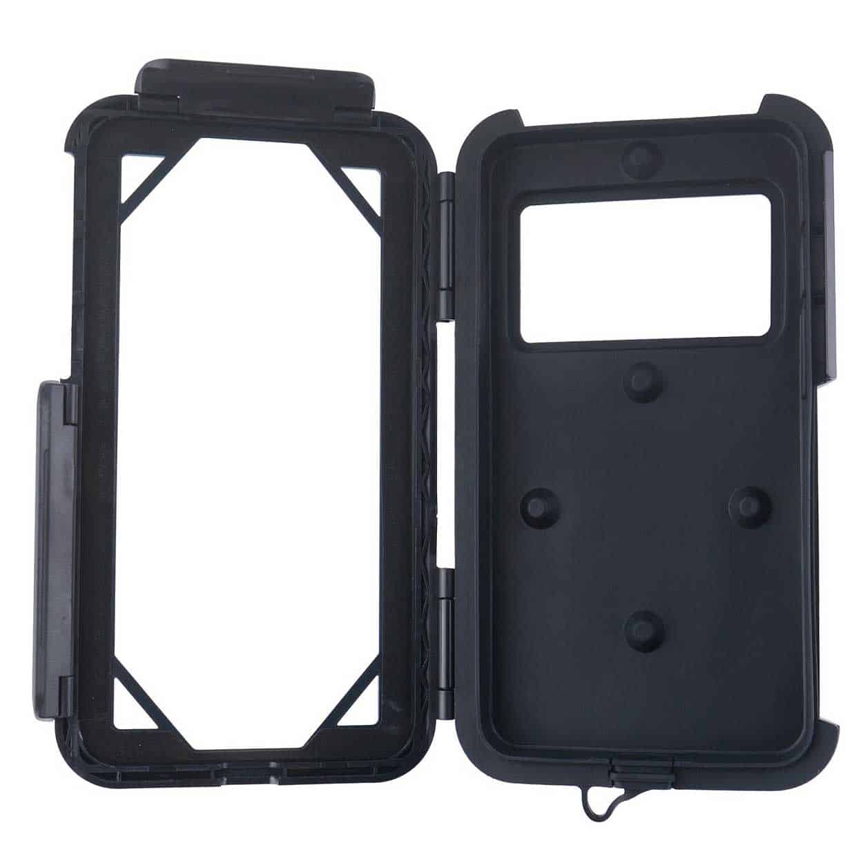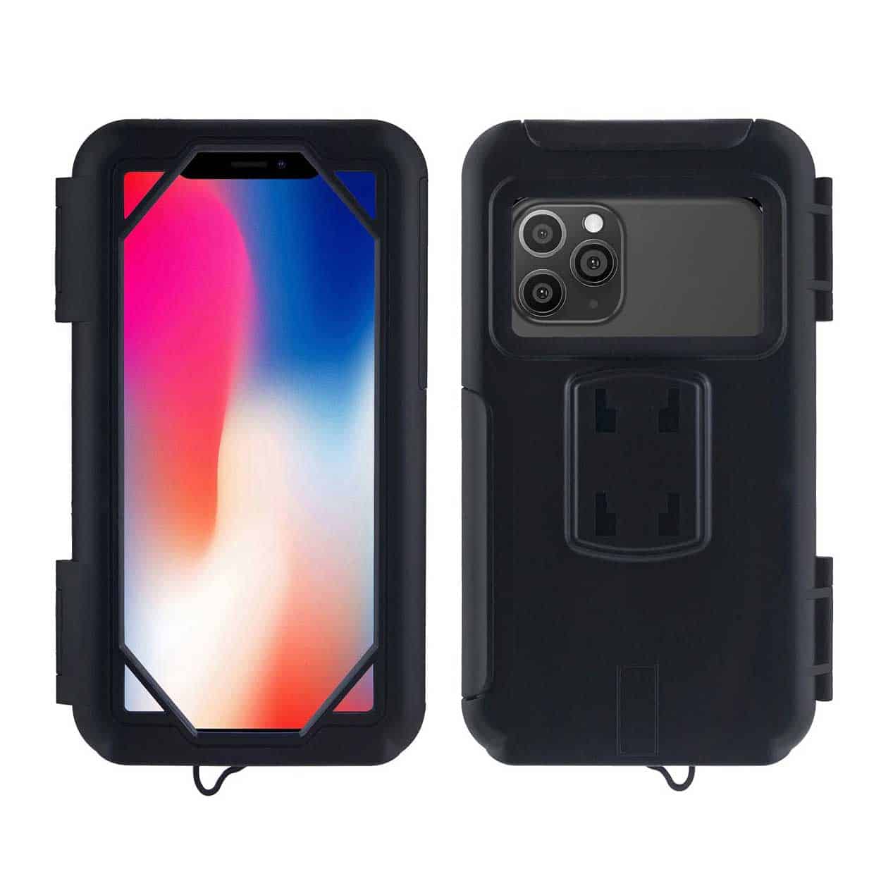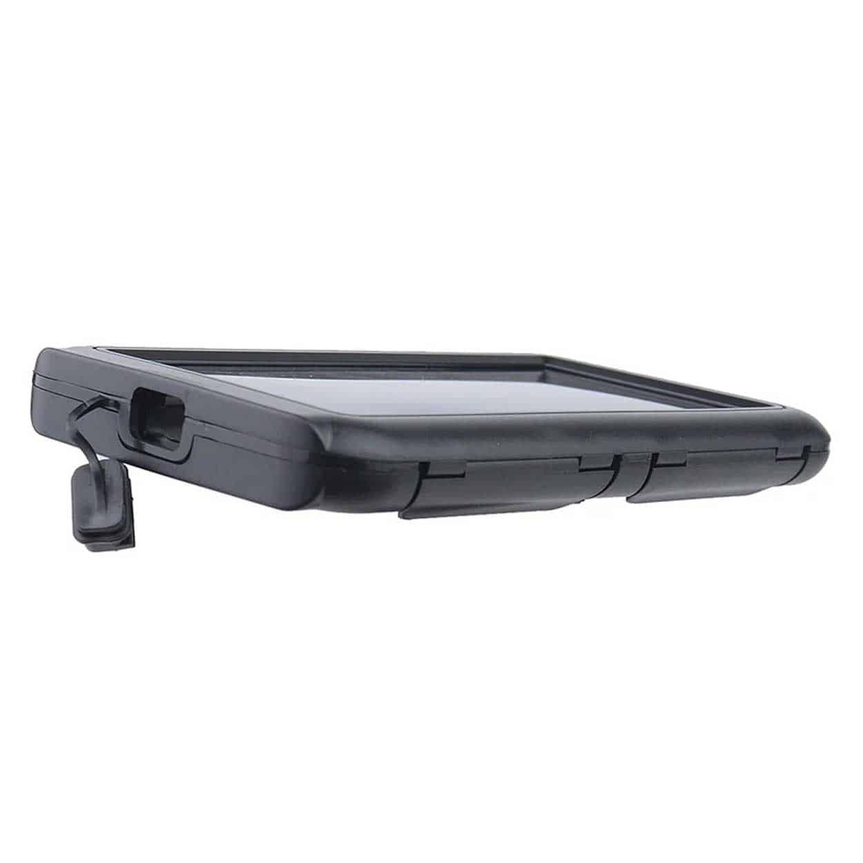 Vattentät mobilhållare för cykel som kombinerar styrefäste och skyddande cykelväska för telefoner 5,5–7,4 tum. Fodralet skyddar mot regn, snö, sand, lera och smuts samtidigt som touchfunktionen gör att GPS och appar kan användas utan att ta ut mobilen. Hållaren kan roteras 360 grader för liggande eller stående visning. Kamerahål gör det möjligt att filma när mobilen sitter i fodralet. Öppning för laddkabel finns, men skyddet minskar om den lämnas öppen. Avsedd för väta, inte nedsänkning.