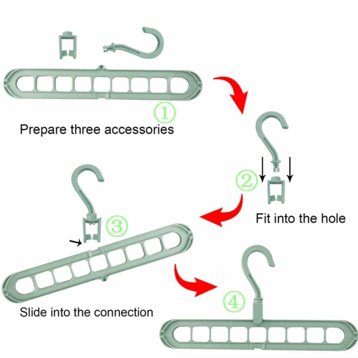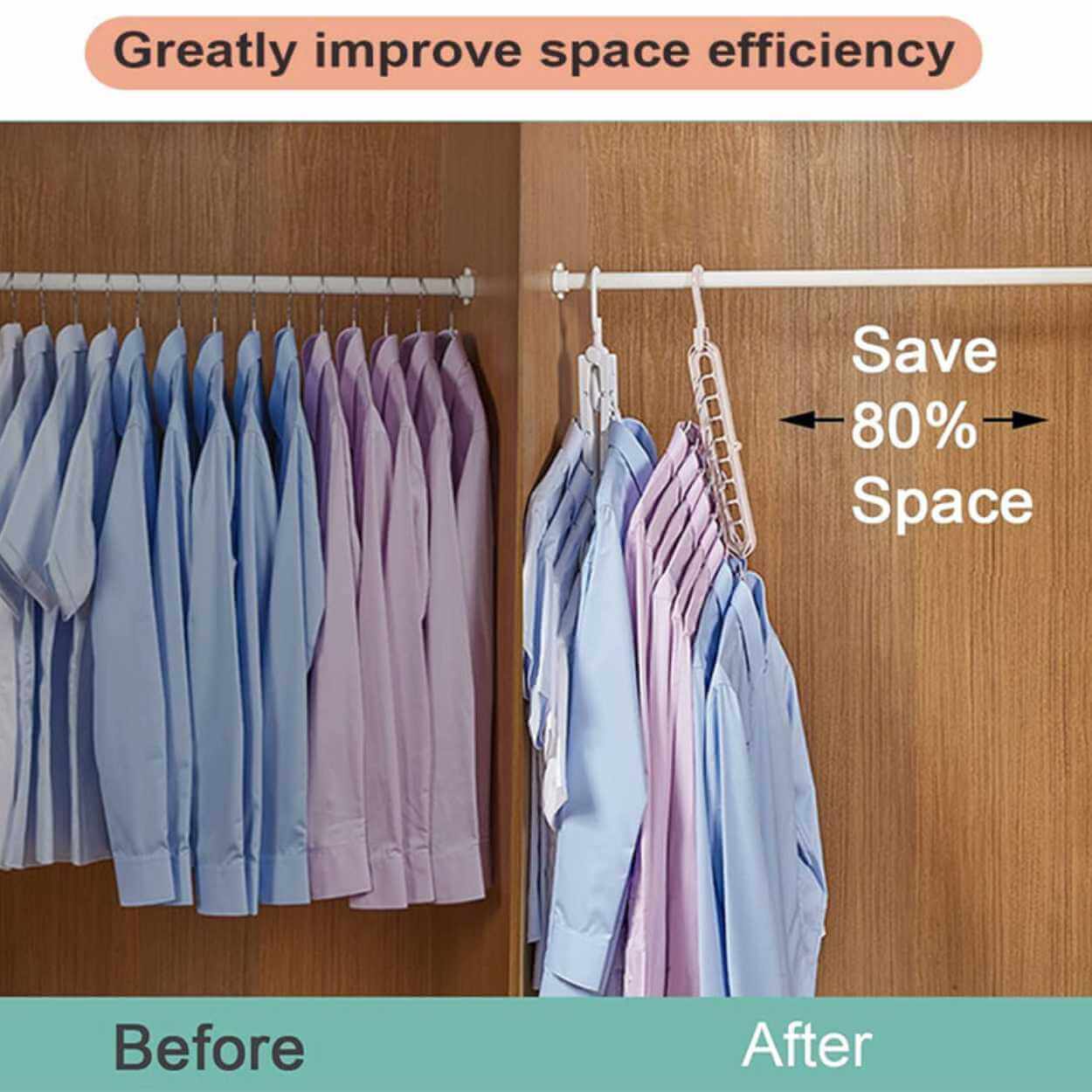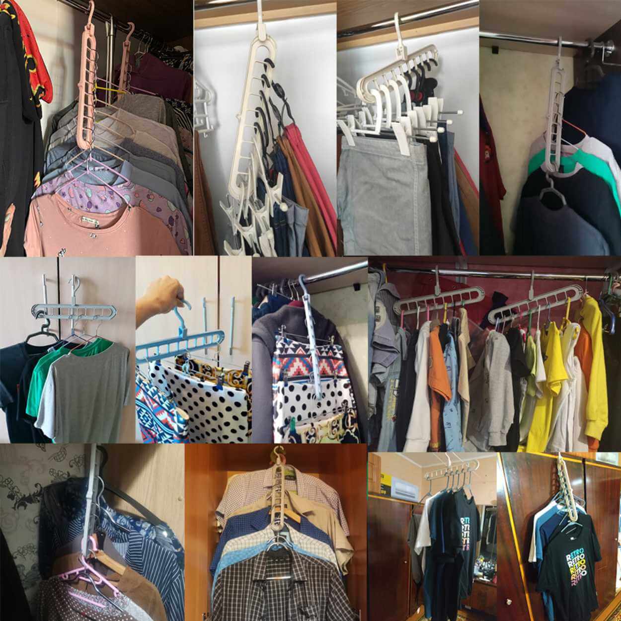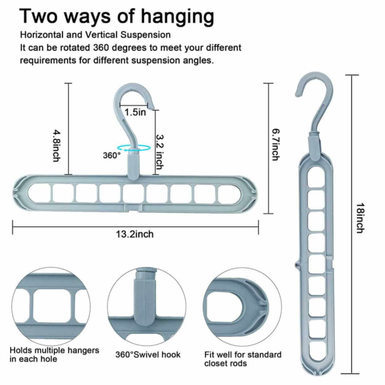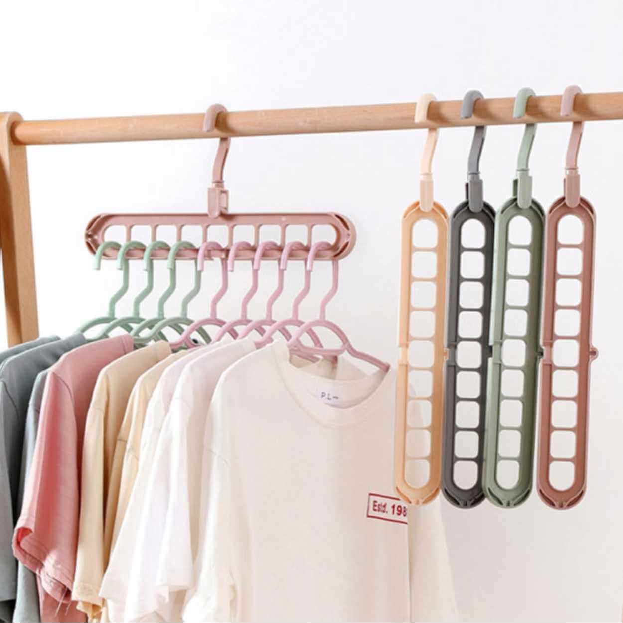 Multihängare för garderob som hjälper till att samla flera plagg på samma upphängning och frigöra utrymme. Konstruktionen har 9 hål som gör det enkelt att sortera skjortor, toppar eller accessoarer mer överskådligt. Krokarna kan roteras 360° så att upphängningen kan anpassas efter garderobsstång och plaggens form. Produkten kan användas både vertikalt och horisontellt beroende på hur mycket plats som behövs. Tillverkad i PP-plast för en stabil och lätt lösning i vardagen.