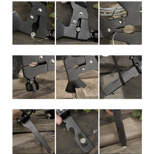 Rejält multiverktyg 17-i-1 för camping, vandring, fiske och enklare arbeten hemma. Konstruktionen kombinerar rostfritt stål med aluminium och nylon för bra hållbarhet och greppvänlig hantering. Verktyget samlar flera vanliga funktioner i ett format som är lätt att bära, inklusive yxa, tång, fil, fiskfjällare och skruvmejsel. Medföljande fodral med bältesögla gör att det kan sitta säkert på utrustningen och vara snabbt tillgängligt när du behöver skära, öppna eller fixa något på plats.