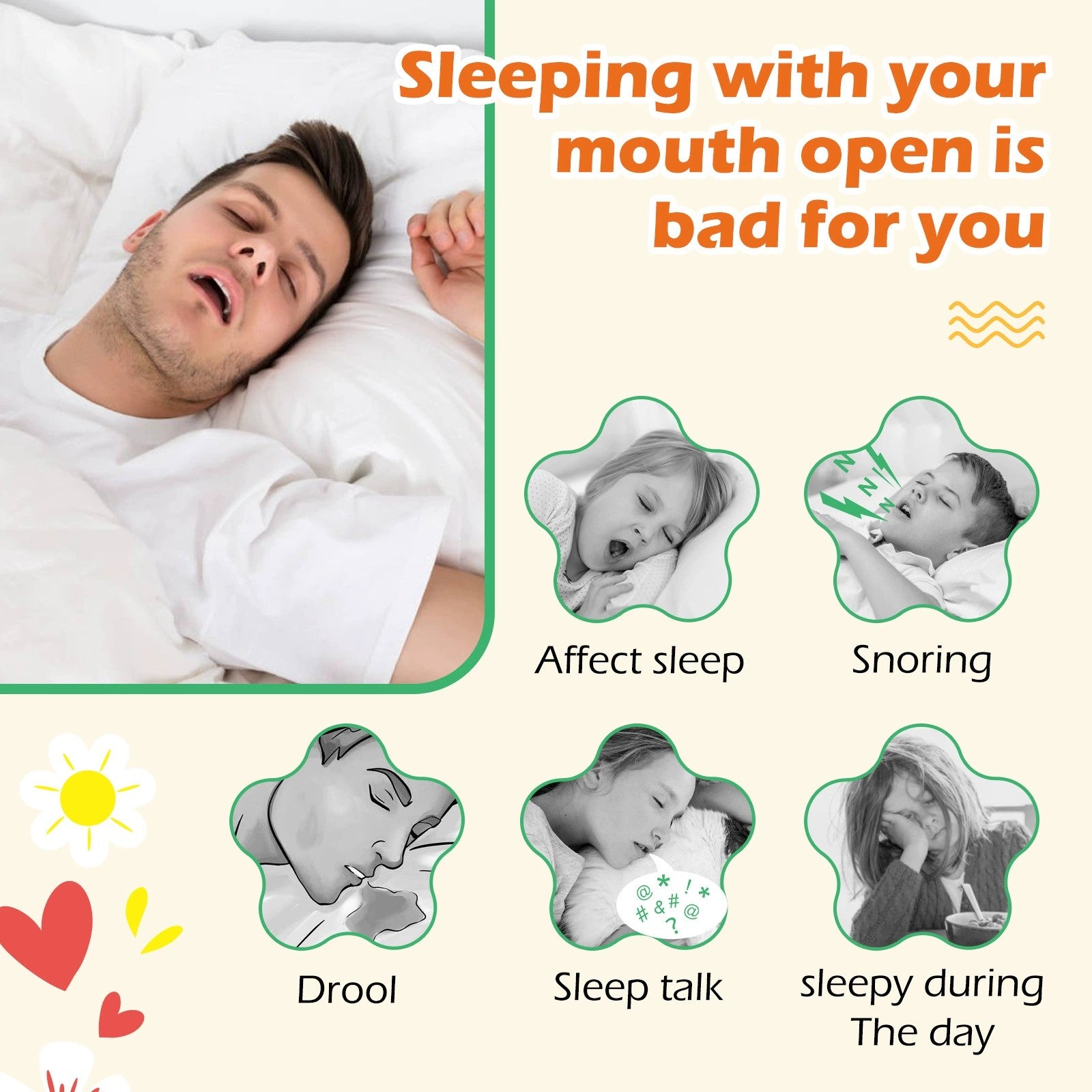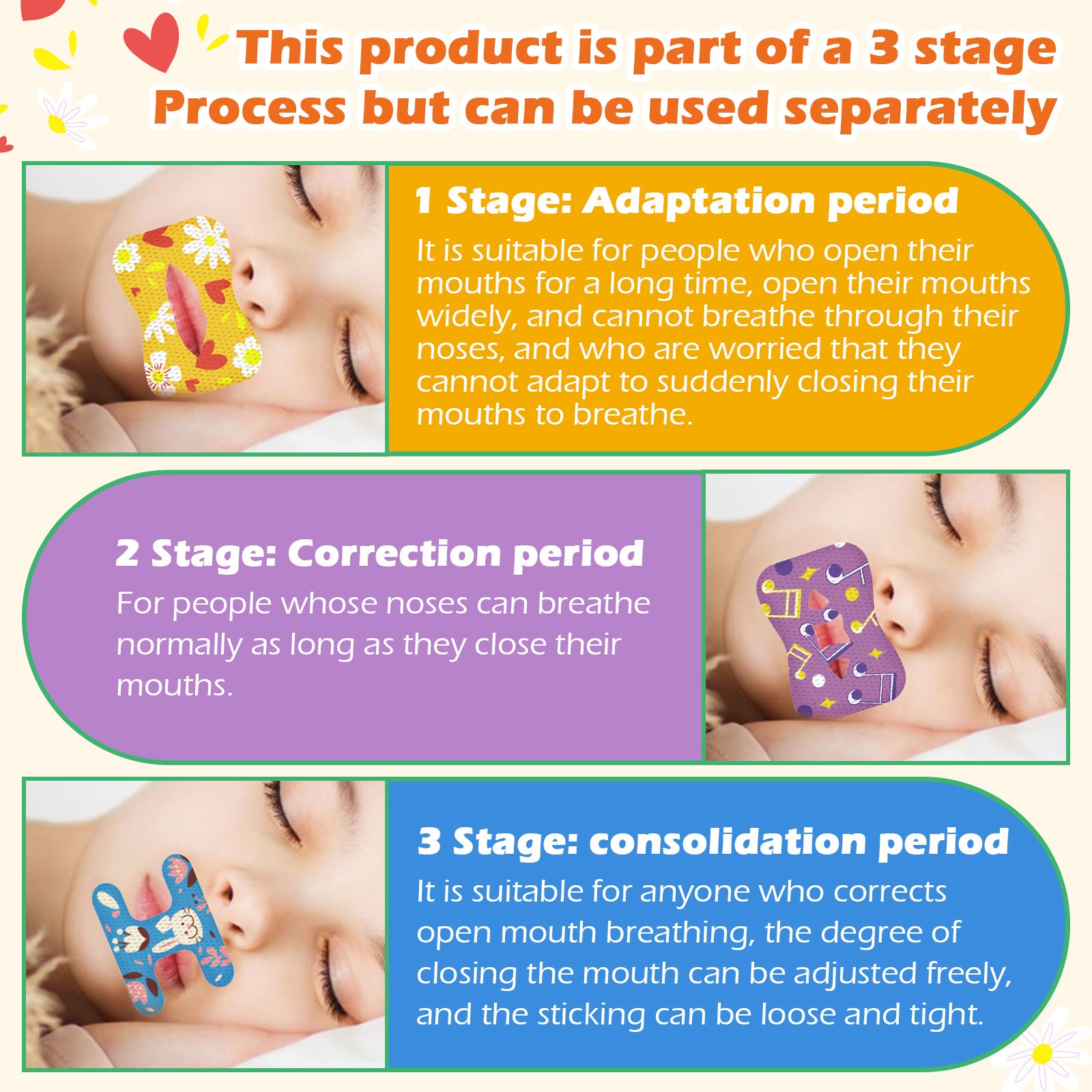 Muntejp som främjar näsandning för bättre sömn och minskad snarkning. Den milda, hudvänliga tejpen sluter läpparna skonsamt och hjälper till att minska dregling, torr mun och störd nattsömn. Det trestegsbaserade systemet gör det enkelt att vänja sig och hitta rätt nivå, men varje steg kan också användas separat. Hypoallergen och säker för känslig hud, enkel att applicera och ta bort – både dag och natt. Ett enkelt och effektivt hjälpmedel för lugnare sömn och bättre återhämtning.