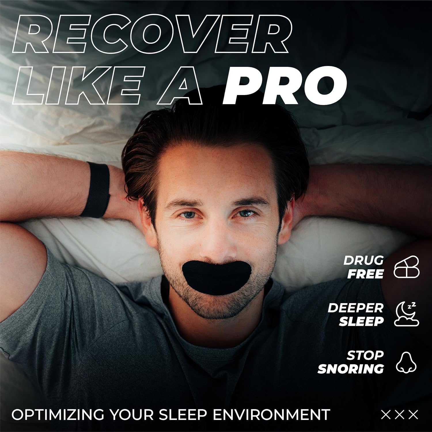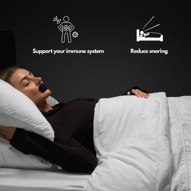 Muntejp för sömn hjälper till att hålla munnen stängd under natten och uppmuntrar näsandning. Remsorna är tillverkade i andningsbart tyg och fäster med ett latexfritt, hudvänligt lim som sitter säkert utan att kännas obekvämt. Tejpen tas enkelt bort på morgonen och är utformad för att inte lämna märken på huden. Storleken 76 x 38 mm passar de flesta vuxna och gör appliceringen snabb. Förpackningen innehåller 30 engångsremsor för regelbunden användning hemma eller på resa.
