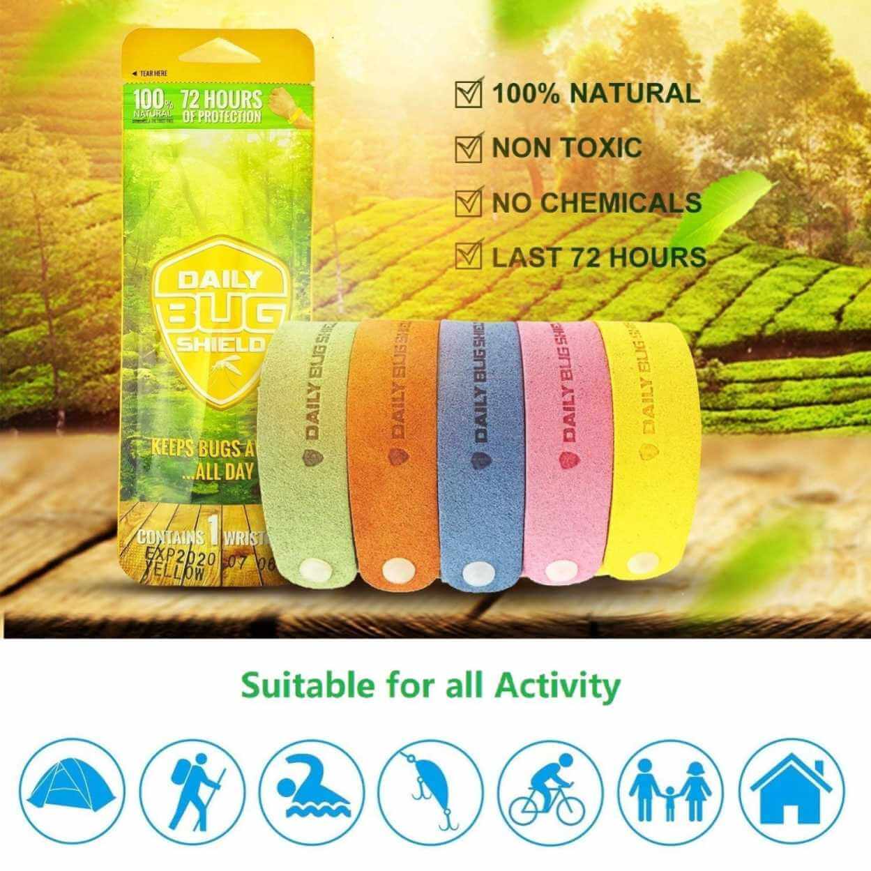 Myggarmband ger ett enkelt myggskydd för utomhusbruk utan att behöva smörja in huden. Armbandet avger en doft från eteriska oljor som citronella, eucalyptus och mynta, vilket hjälper till att avskräcka mygg. Varje armband ger upp till 72 timmars effekt efter öppning och kan användas vid camping, vandring, trädgårdsarbete och andra aktiviteter. Den flexibla, justerbara passformen gör att armbandet sitter bekvämt på både vuxna och barn och kan bäras på handled eller fotled.