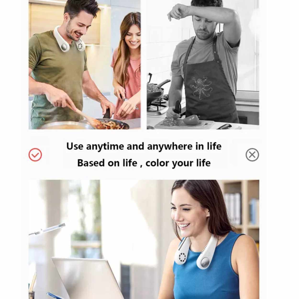 Uppladdningsbar nackfläkt som bärs runt halsen för handsfree svalka vid arbete, pendling och utomhusaktiviteter. Tre hastighetslägen gör det enkelt att välja luftflöde efter temperatur och behov. Den tystgående driften passar även i lugna miljöer som kontor och bibliotek. Inbyggt 2000 mAh-batteri ger cirka 6–10 timmars användning beroende på valt läge och laddas smidigt via USB. Ergonomisk form ger stabil passform och jämn kylning utan att du behöver hålla i en fläkt.