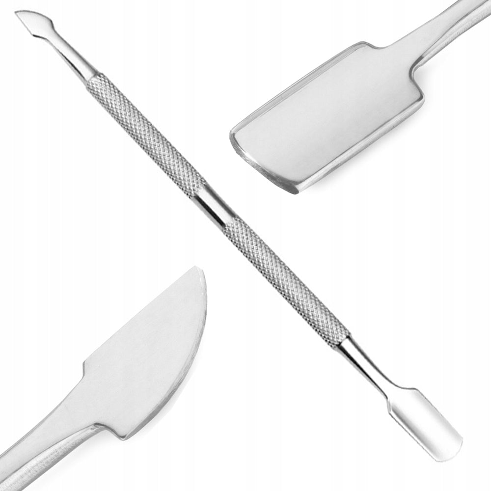 Nagelbandspusher i rostfritt stål för noggrann manikyr hemma eller i salong. Den dubbelsidiga utformningen ger två funktioner i ett verktyg: ena änden puttar tillbaka nagelbanden kontrollerat, den andra skrapar rent nagelplattan från rester av gel och akryl samt död hud. Rostfritt stål gör verktyget slitstarkt och hygieniskt, och det kan rengöras och desinficeras mellan användningar. Skyddsetui ingår för smidig förvaring och för att hålla verktyget fräscht.