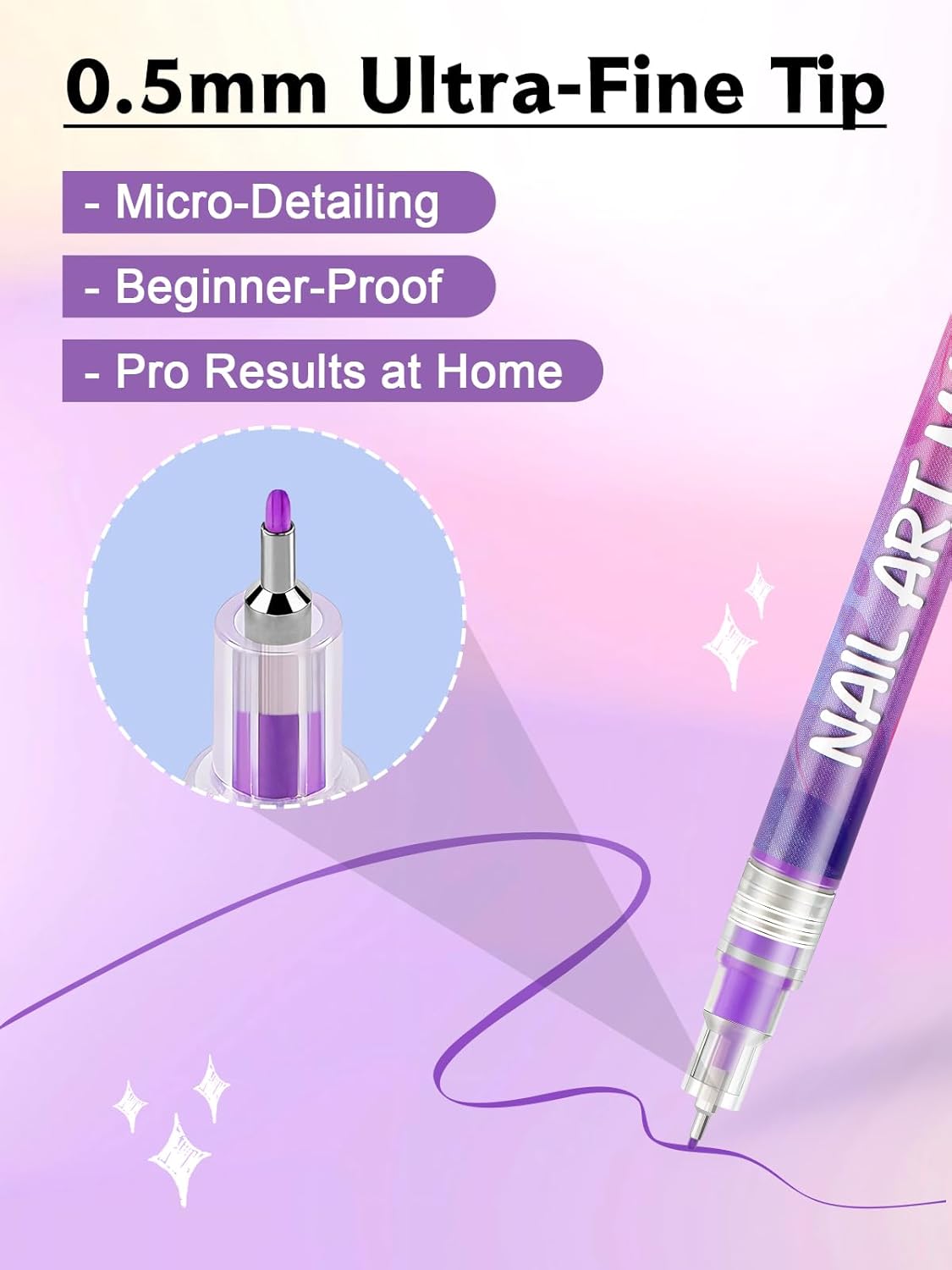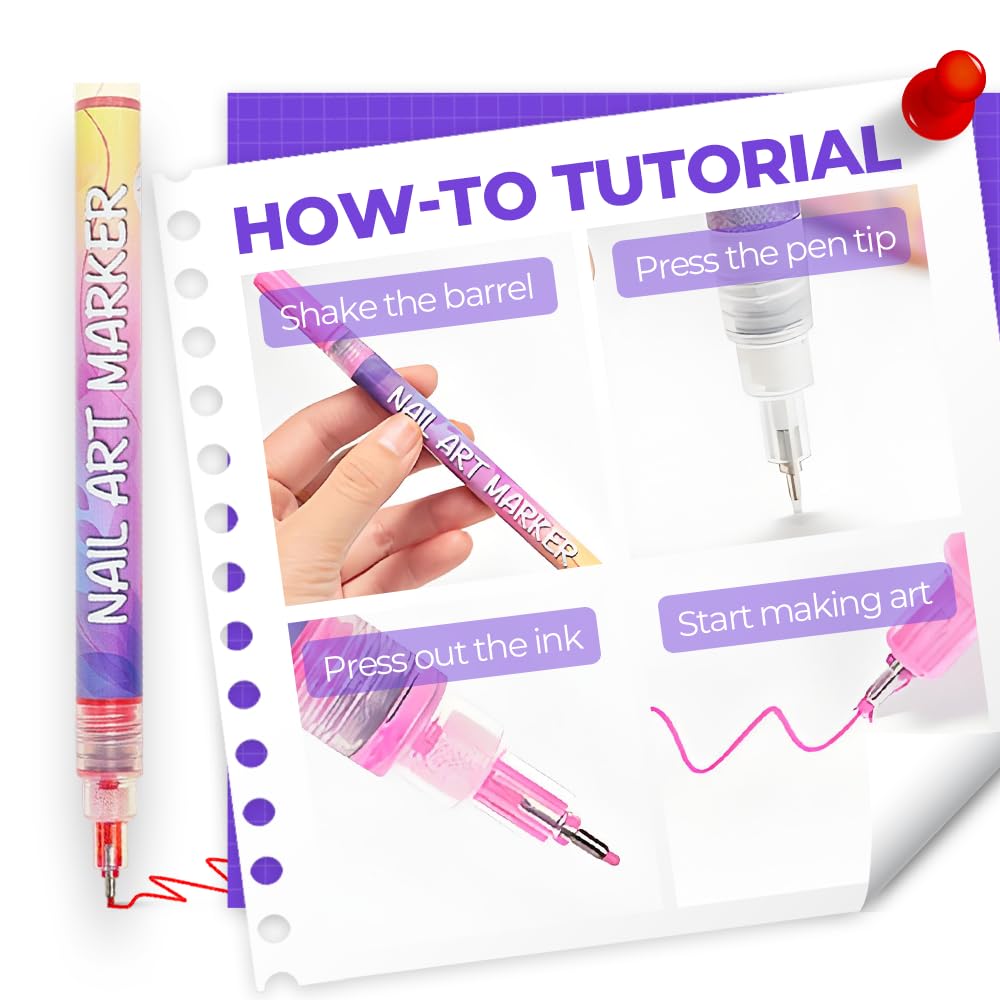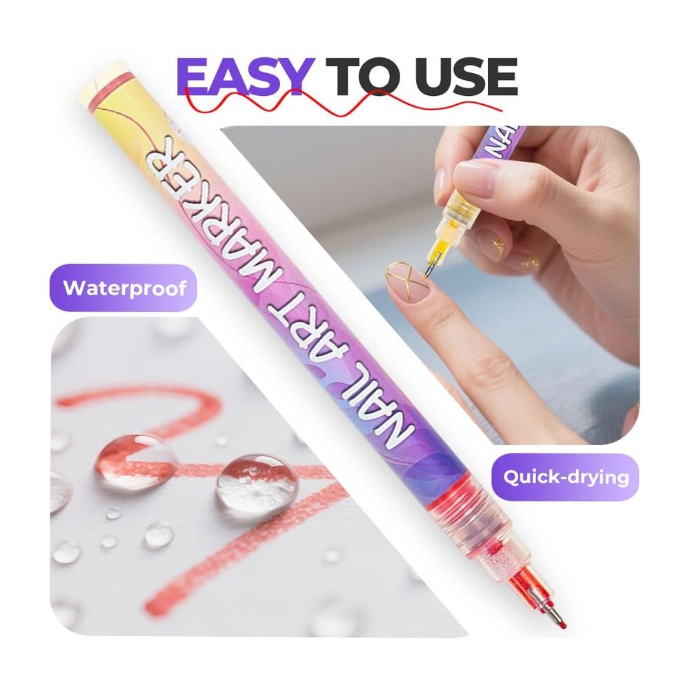 Nagelpennor för detaljerad nail art med vattenbaserat bläck som täcker jämnt och torkar snabbt. Precisionsspetsen på cirka 0,5 mm gör det enkelt att rita tunna linjer, prickar och små motiv, samt skapa fransk manikyr med bättre kontroll. Dubbelsidig utformning ger flexibel design när du vill variera uttryck under arbetet. Starta färgflödet genom att skaka pennan och trycka lätt, sedan är det bara att rita. Vid behov kan färgen korrigeras eftersom den löses i alkohol. Avsluta med topplack för bättre hållbarhet.