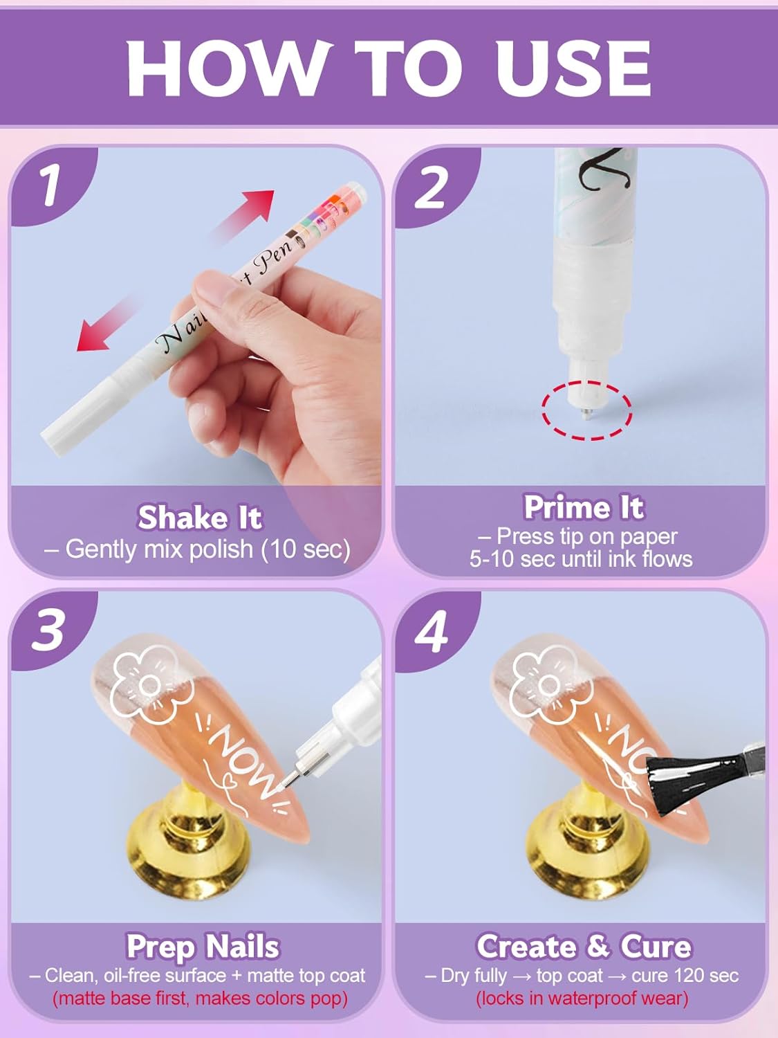 För bästa resultat appliceras designen på torrt baslager. Om flödet känns ojämnt, skaka igen och pumpa spetsen lätt mot en yta tills färgen kommer. Låt motivet torka helt innan topplack läggs för att minska risken för att linjer flyter ut. Vid korrigering kan en liten mängd alkohol på pensel eller tops användas för att lösa upp färgen lokalt.