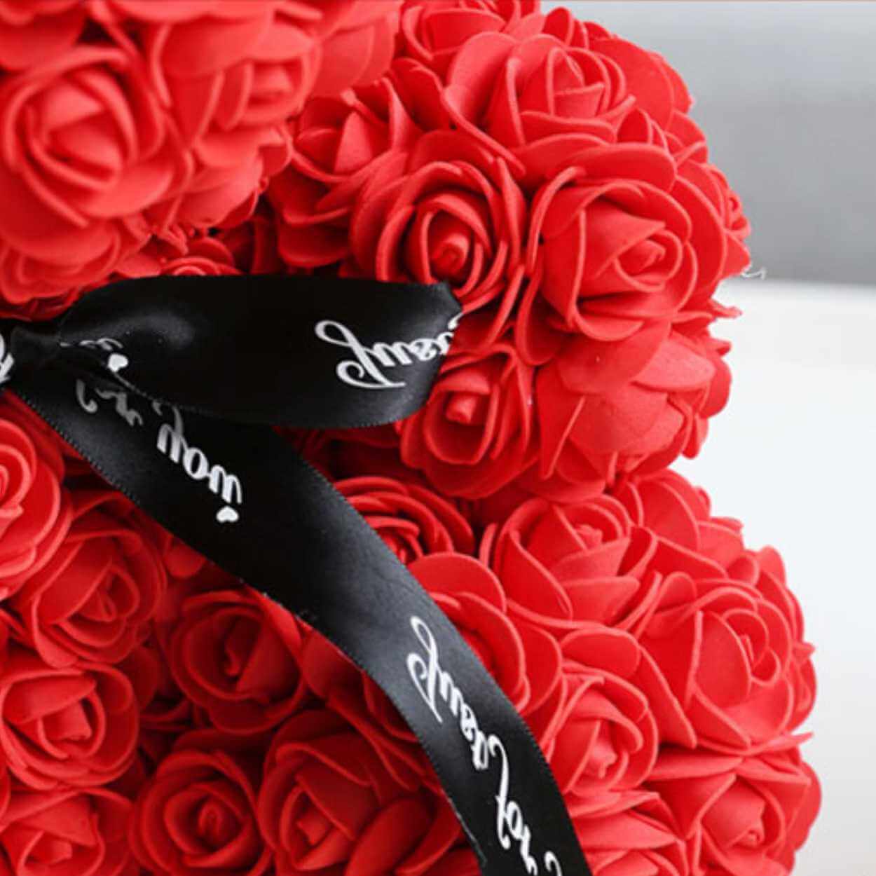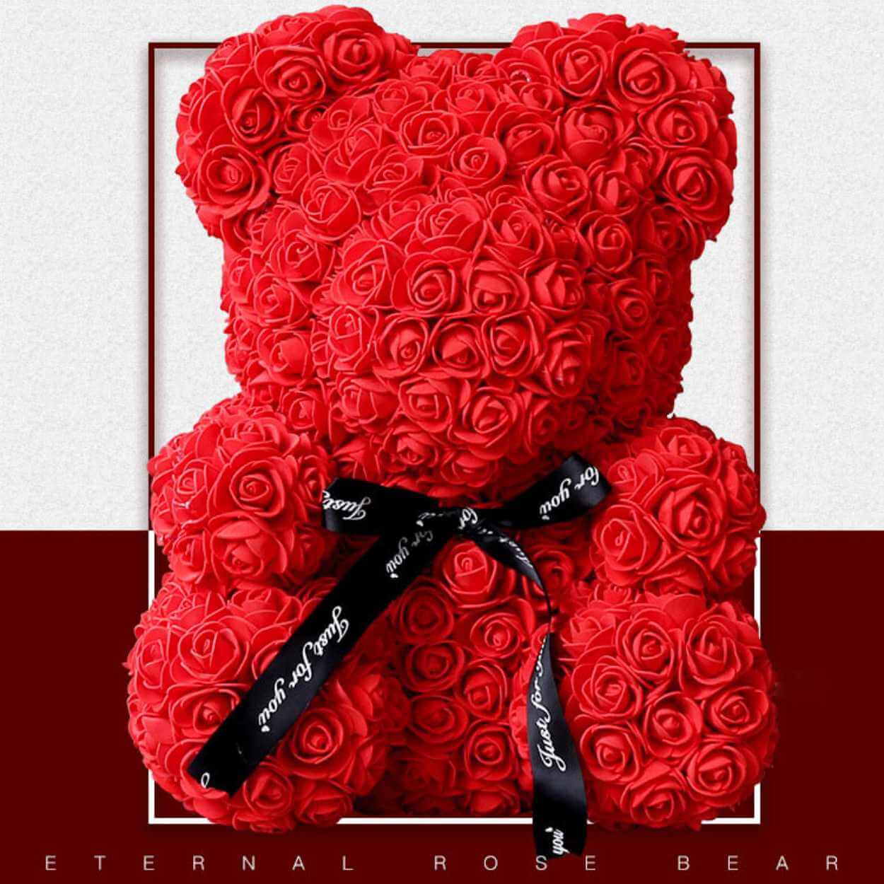 Nallebjörn av konstrosor som fungerar som en dekorativ present och en hållbar blomsterdekoration. Rosorna är formade till en björn som behåller sitt uttryck över tid och kräver ingen skötsel. En rosett med texten Just for you ger ett tydligt gåvouttryck och gör den enkel att ge bort utan extra inslagning. Passar som prydnad i hemmet, på ett presentbord eller som minnesgåva vid firanden. Levereras som en komplett björn.