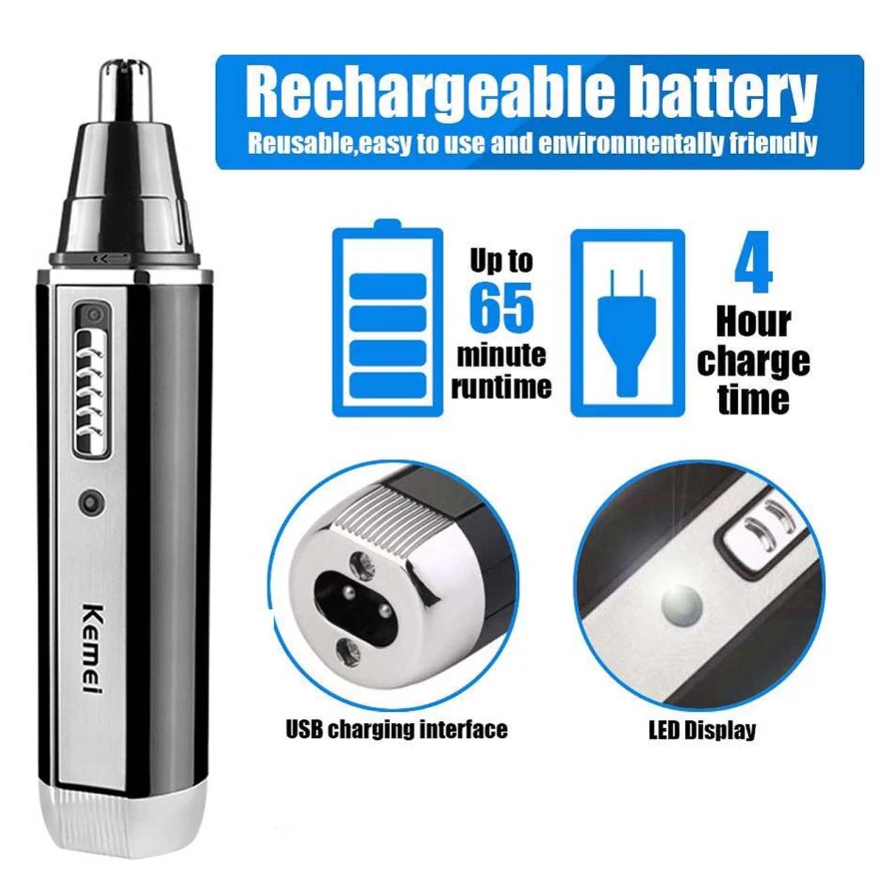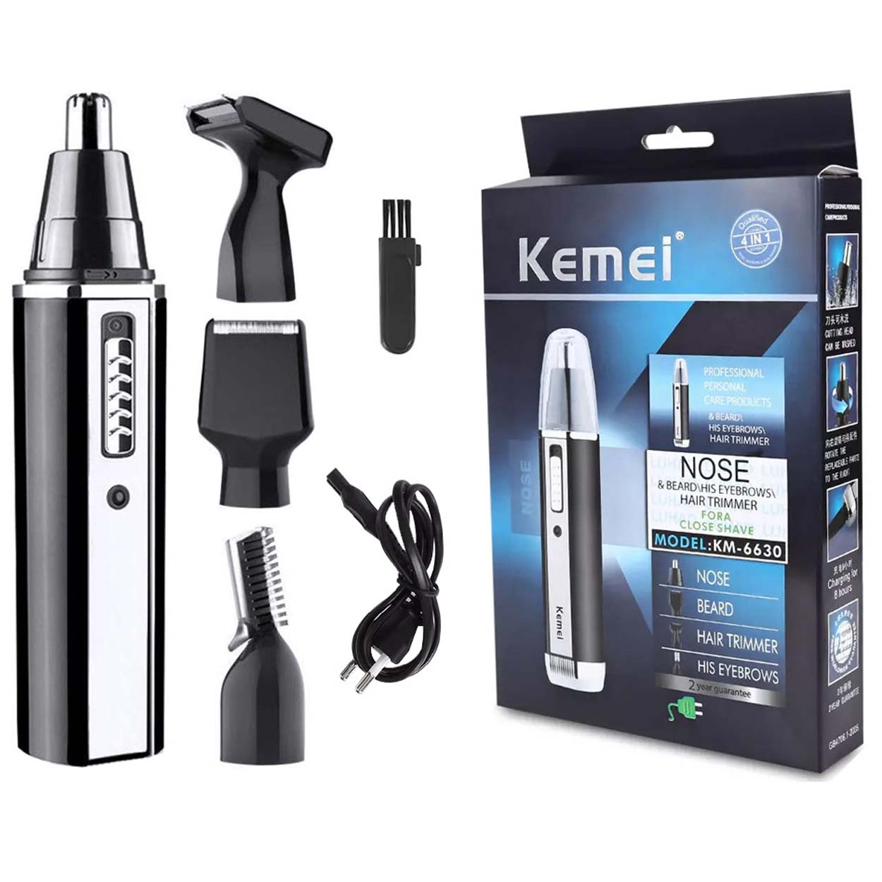 4-i-1 trimmer för snabb och precis trimning av näshår, öronhår, skägg och ögonbryn. Fyra utbytbara trimmerhuvuden gör det enkelt att växla mellan detaljtrimning och formning av exempelvis polisonger och bryn. Rostfria blad ger ett jämnt resultat och är smidiga att hålla rena efter användning. Inbyggt uppladdningsbart batteri laddas via medföljande kabel, vilket minskar behovet av batteribyten. Det kompakta formatet gör trimmern lätt att förvara och ta med vid resor.