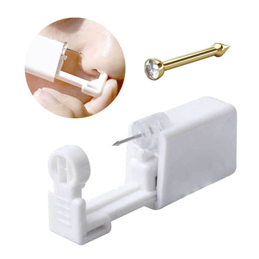 Näspiercing håltagningskit för dig som vill göra håltagning hemma. Verktyget är sterilt och avsett för engångsbruk. Placera verktyget där hålet ska sitta och använd ett lätt tryck för att föra piercingen genom näsan. Läkesmycket ingår och fästs direkt efter håltagningen, vilket gör processen smidig och snabb. Smyckets topp har 2 mm diameter för ett diskret uttryck. Produkten uppges uppfylla REACH-krav.