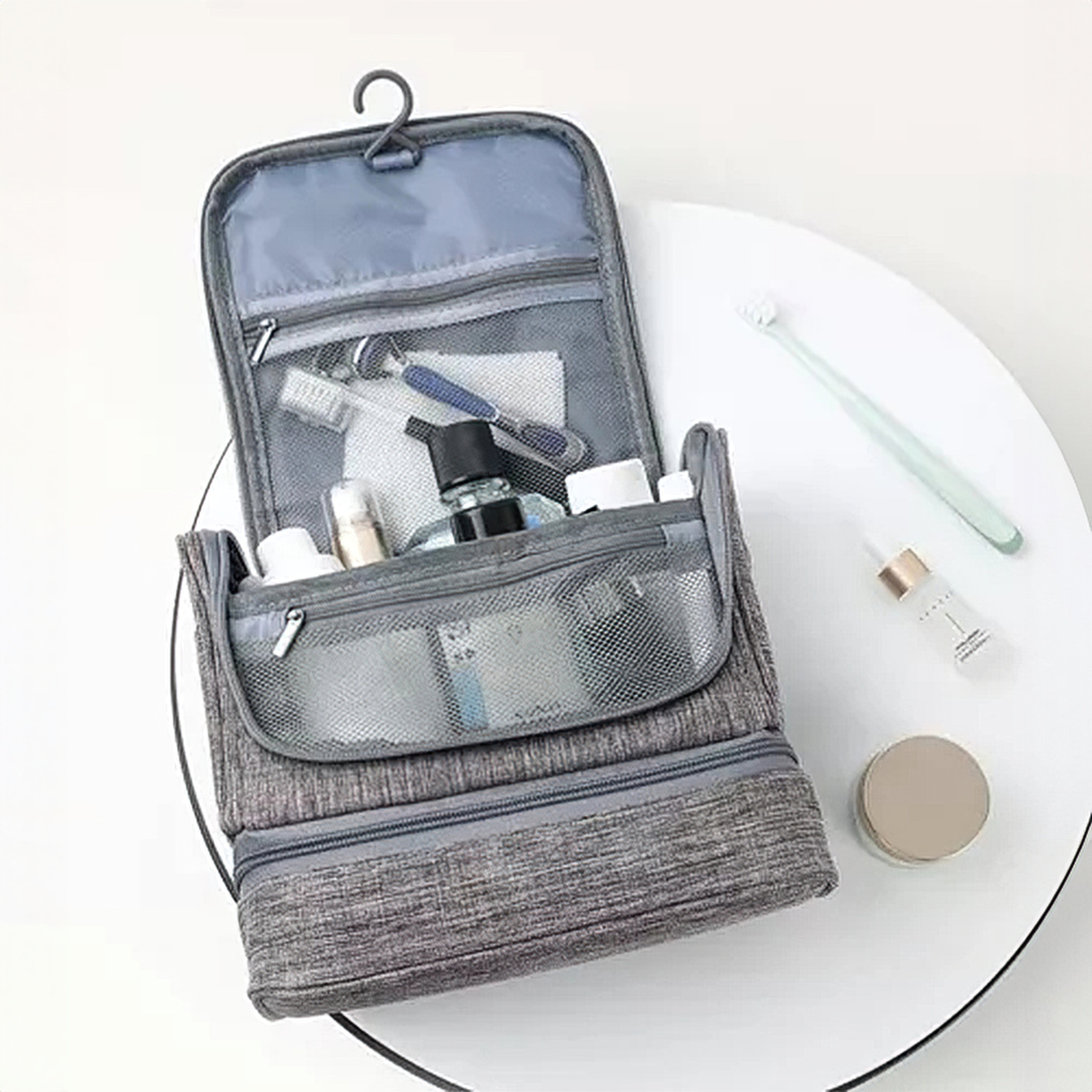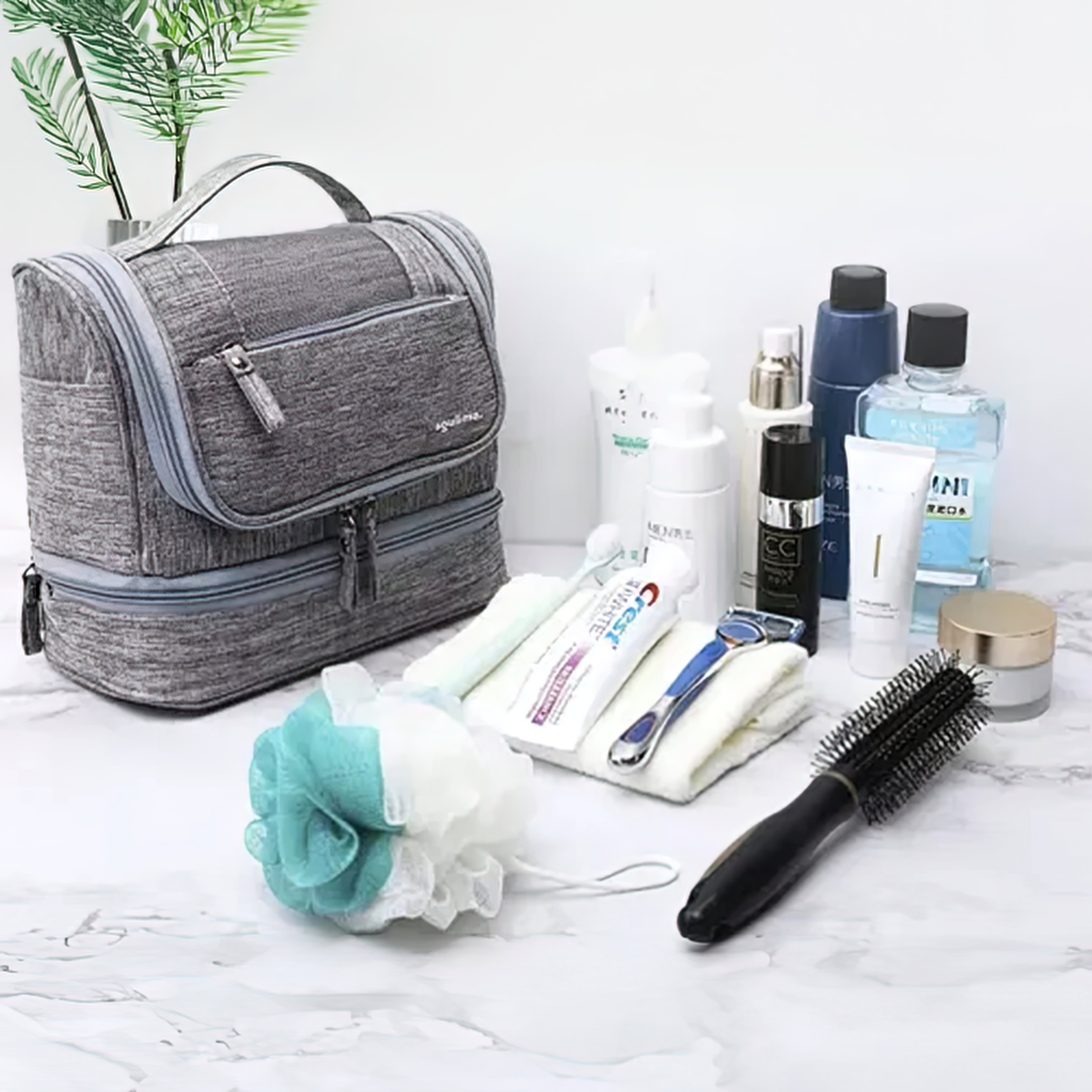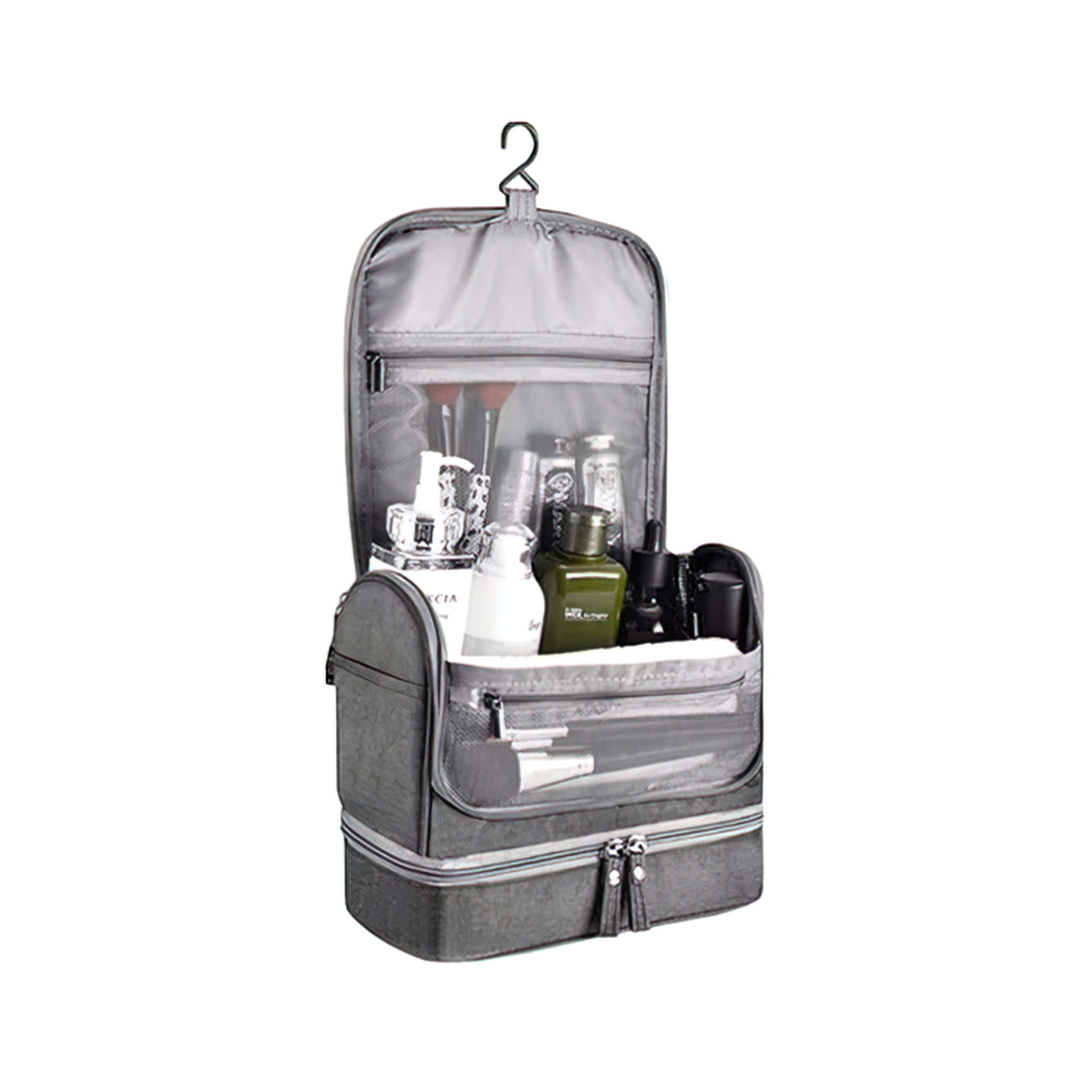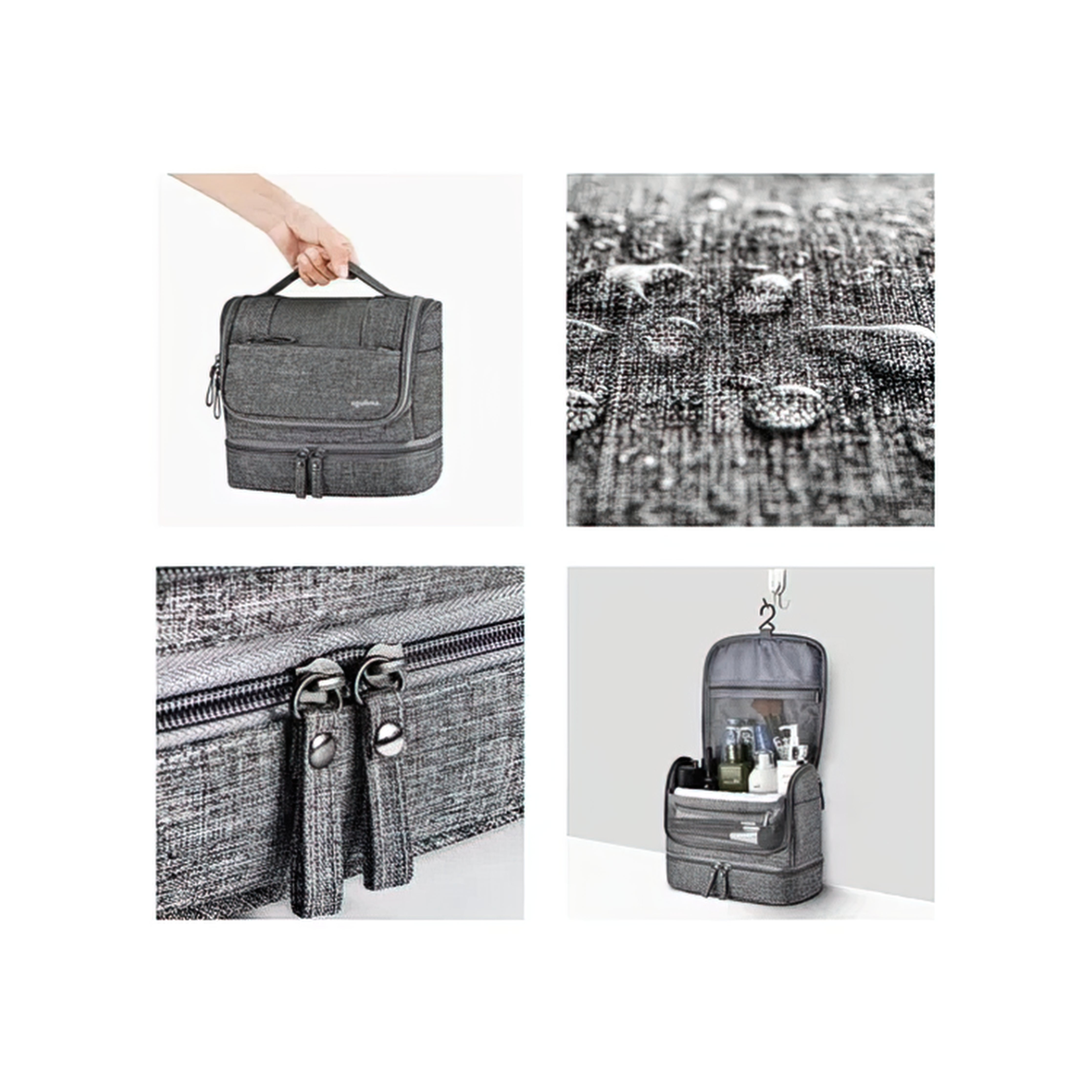 Vattentät necessär för smink och hygienartiklar som gör det enkelt att hålla ordning på resan. Häng upp väskan med den integrerade kroken för snabb åtkomst vid handfat eller i duschutrymme. Elva fickor ger tydlig sortering av småsaker, flaskor och tillbehör, och en termisk ficka hjälper till att skydda känsliga produkter. Dragkedjorna håller innehållet på plats under transport, medan handtaget gör väskan smidig att bära mellan hotell, gym och arbete.