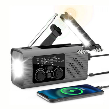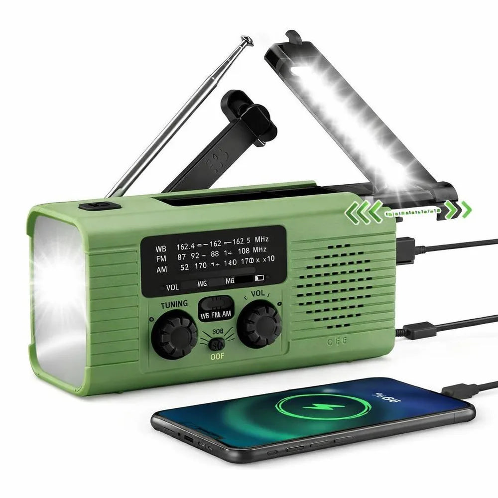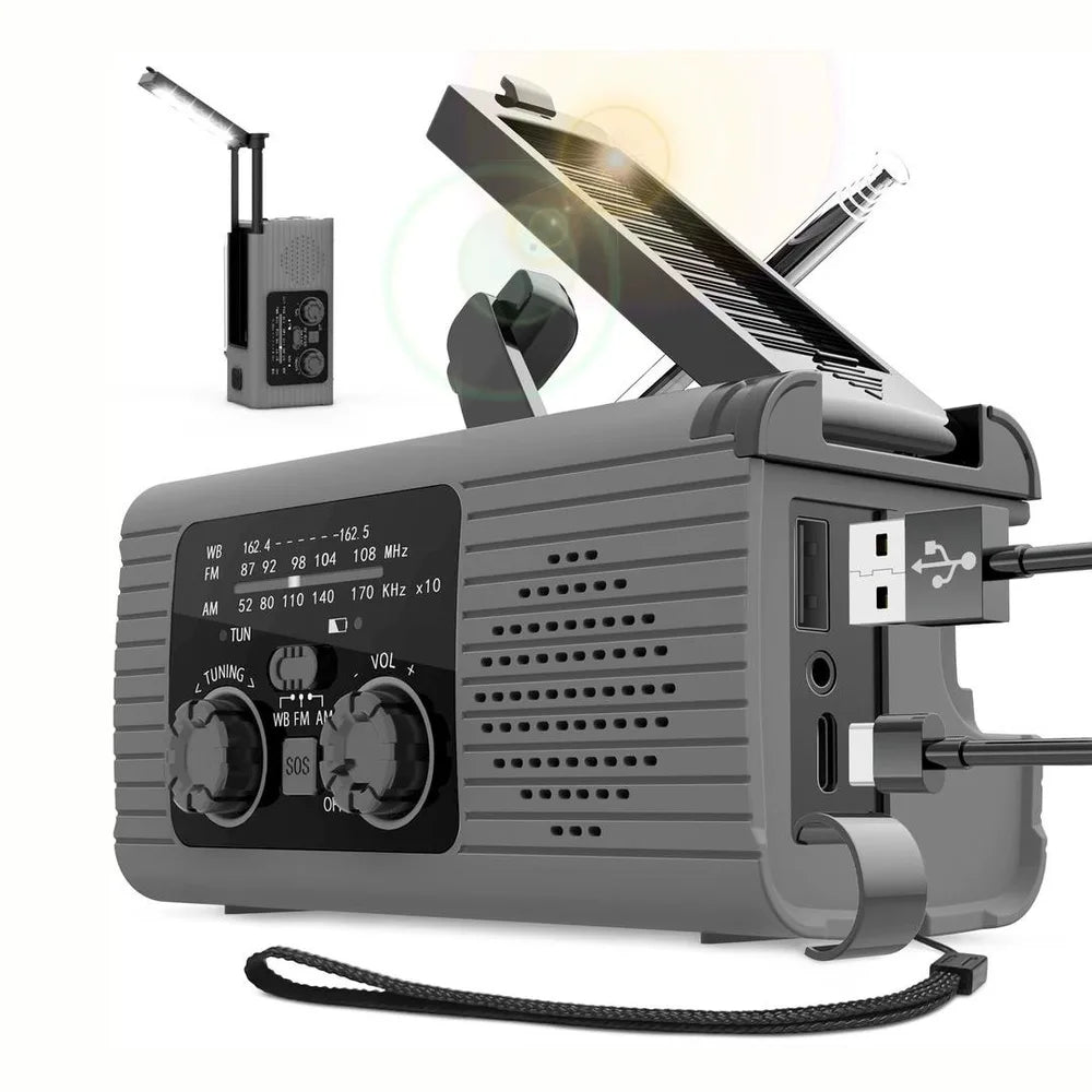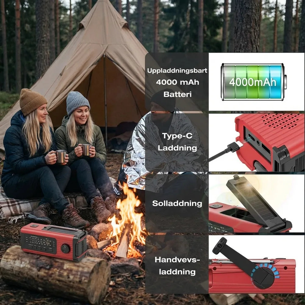 Nödradio för krisberedskap och friluftsliv som kombinerar multibandsradio (AM/FM/WB) med flera sätt att hålla strömmen igång. Ladda via handvev när el saknas, använd solpanelen i dagsljus eller anslut USB för vanlig laddning. USB-A-utgången gör att enheten kan fungera som powerbank för mobil och andra små USB-enheter. Inbyggd LED-ficklampa ger praktisk nödbelysning och SOS-larm hjälper vid signalering. Teleskopantenn och 30 förinställda stationer gör det enkelt att snabbt hitta viktiga sändningar.