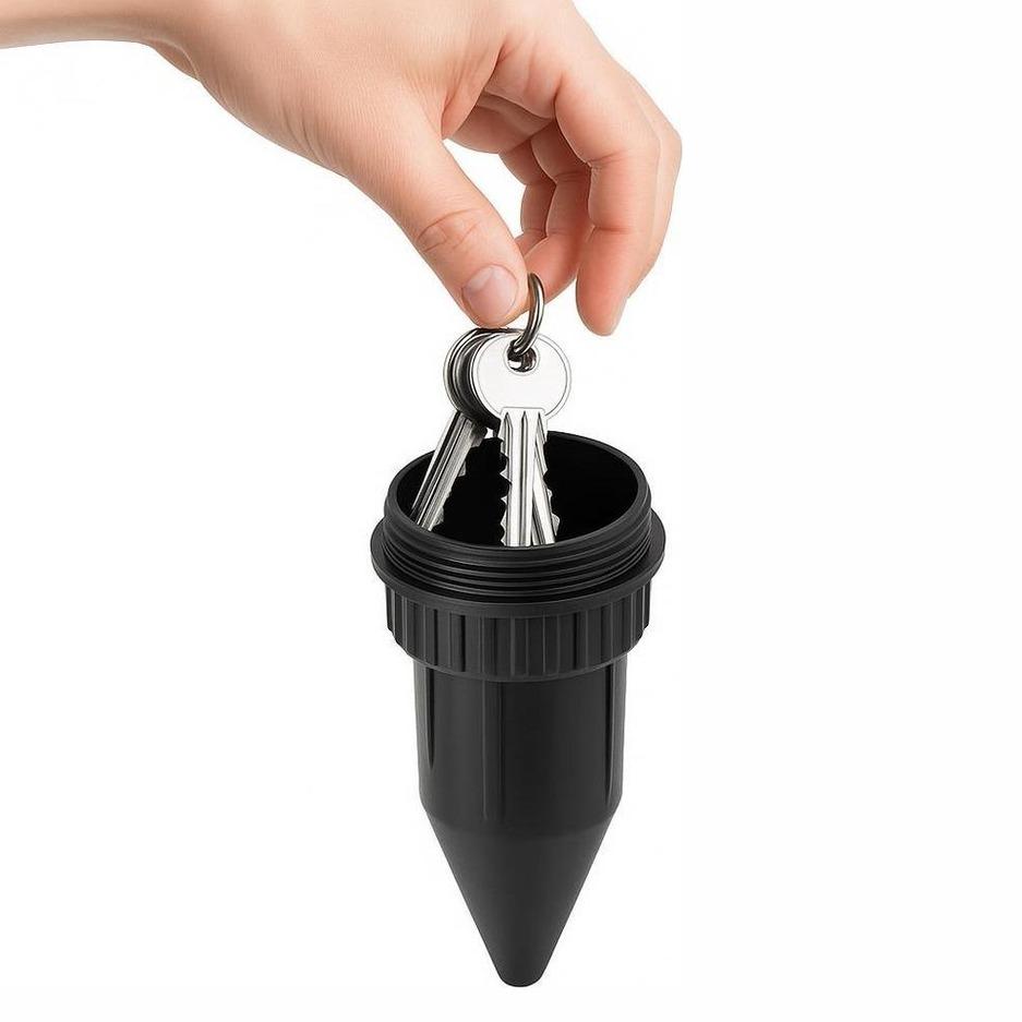 Nyckelgömma i sprinklerutförande som ger diskret förvaring av reservnyckel utomhus. Formen smälter in i trädgård och rabatt och gör gömman mindre iögonfallande än en synlig nyckelbox. Skruvlocket är lätt att öppna när nyckeln behövs och hjälper samtidigt till att hålla innehållet på plats. Konstruktionen är av PP-plast och är avsedd för utomhusmiljö där den skyddar mot smuts och fukt vid normal användning. Passar även för små värdesaker som behöver förvaras tillfälligt.