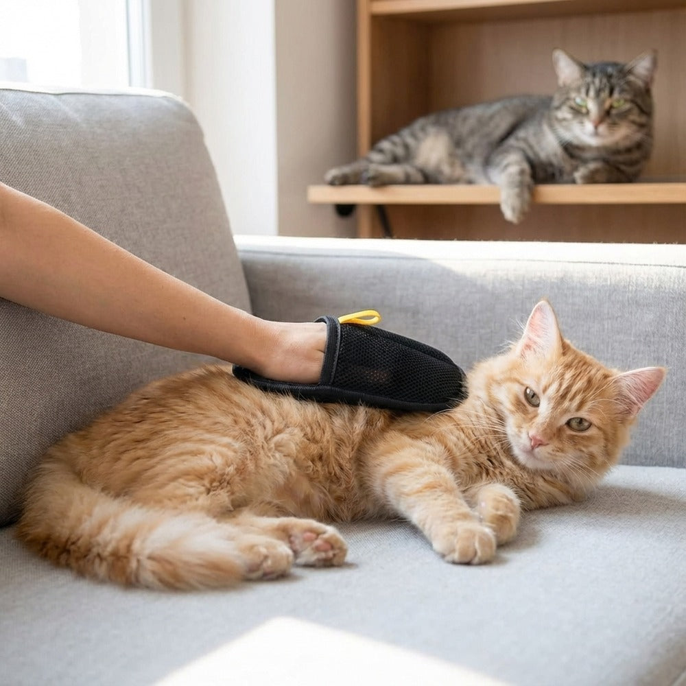 Pälsvårdshandske i handskformat som hjälper till att lyfta och samla upp lös päls vid borstning av hund och katt. Den dubbelsidiga ytan gör att handsken kan användas både i pälsen och på textilier som soffor, filtar och kläder för att fånga upp hår som fastnat. Greppet ger bra kontroll när du stryker över ytan, och efter användning kan hår enkelt dras av från handsken. Ett praktiskt alternativ när du vill minska fällhår i hemmet utan engångsprodukter.