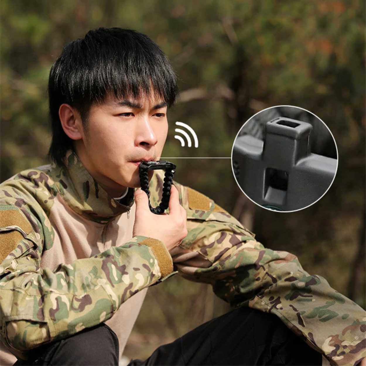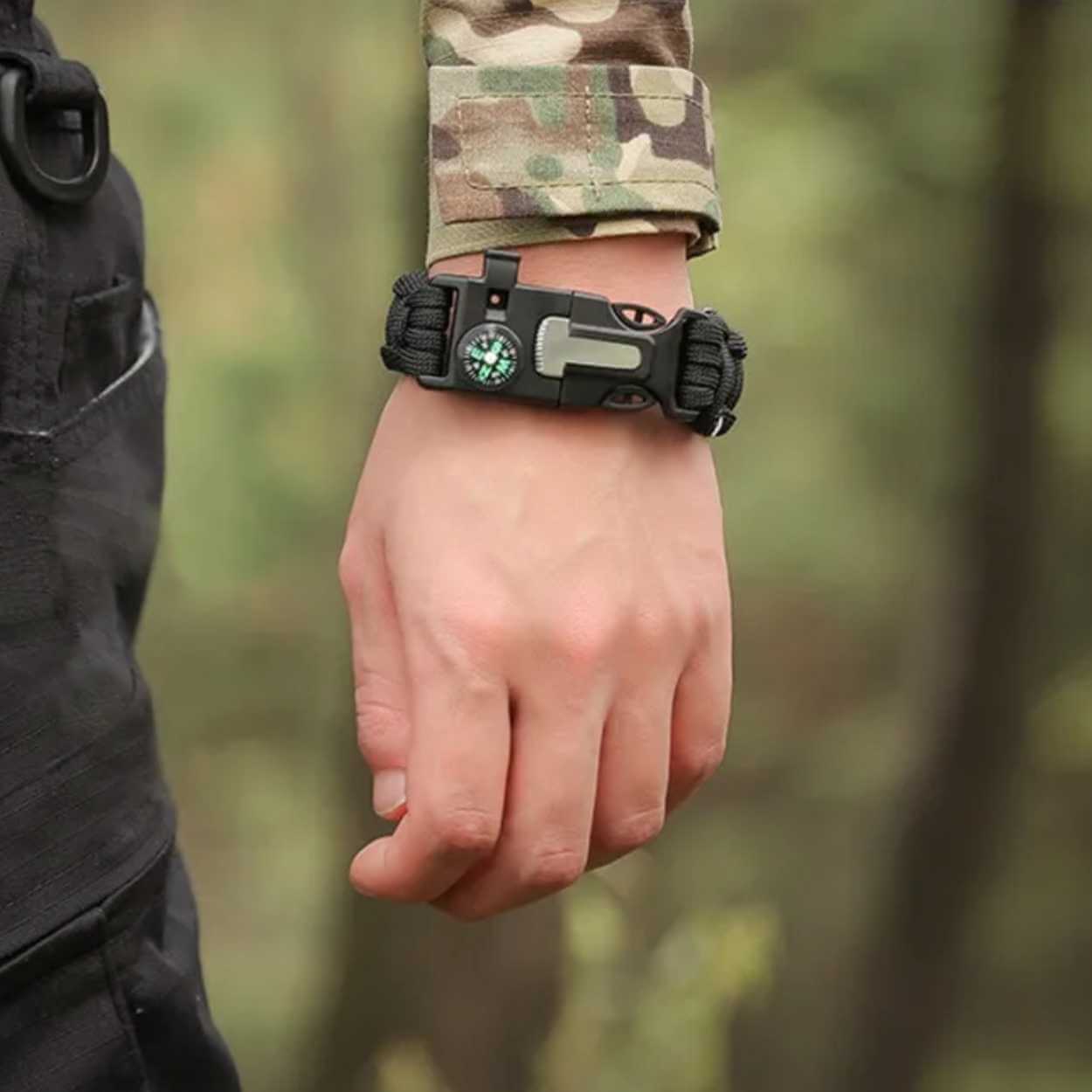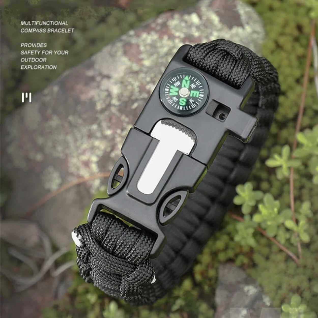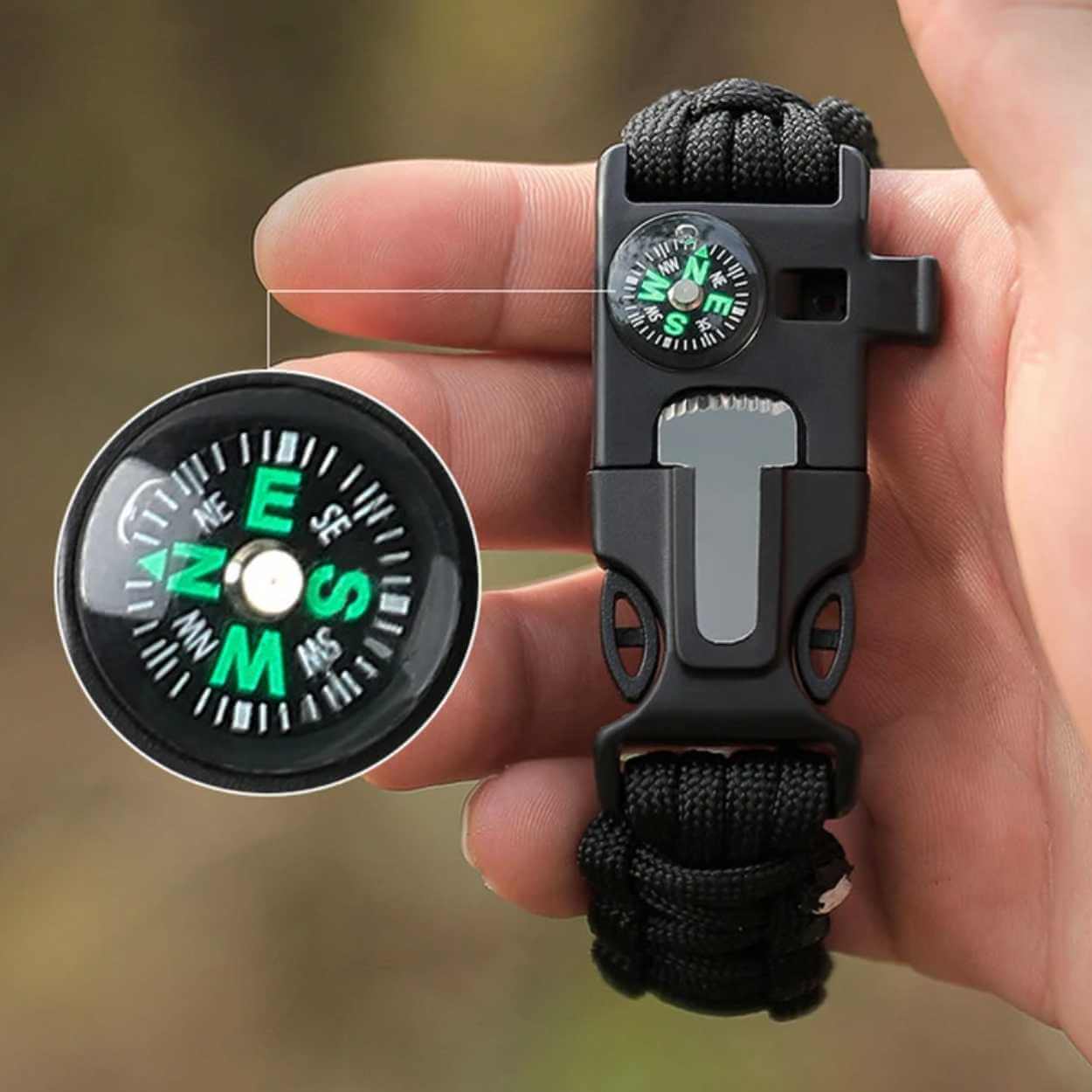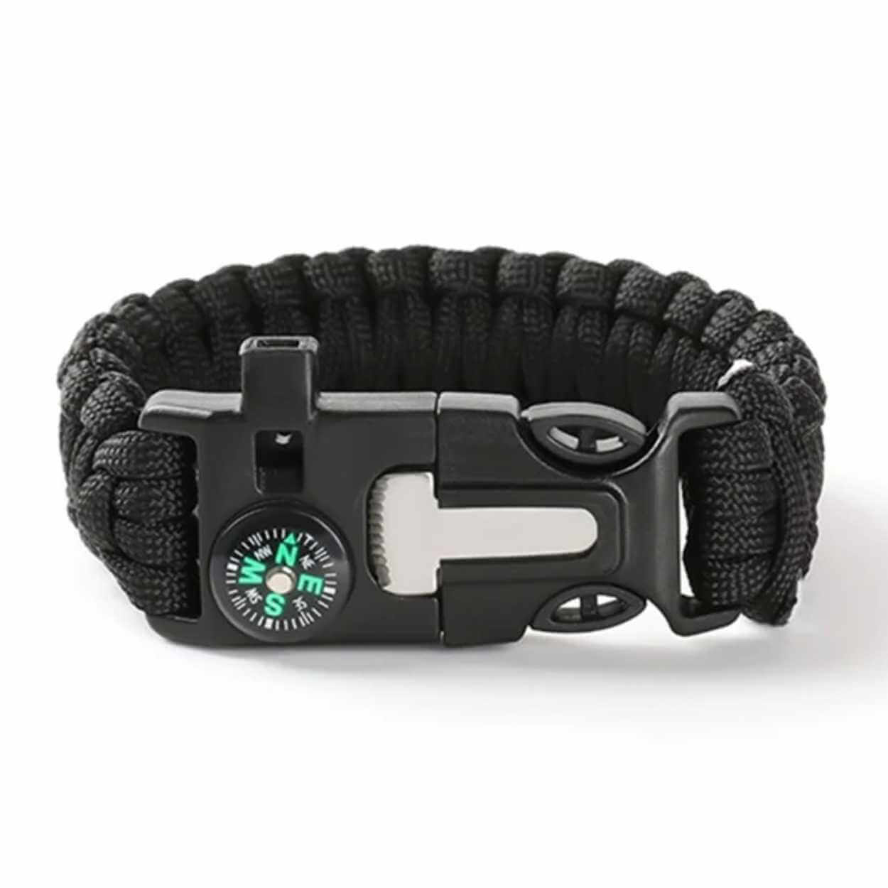 Paracordarmband kombinerar armband och överlevnadsverktyg i ett kompakt format. Spännet har inbyggd visselpipa för snabb signalering och en integrerad kompass som hjälper vid orientering under vandring och friluftsliv. Armbandet levereras med tändstål och gnistblad som ger gnistor för att starta eld när du behöver värme eller matlagning utomhus. Flätad nylonlina ger en slitstark konstruktion som samtidigt håller vikten nere, vilket gör armbandet lätt att bära dagligen eller på tur.