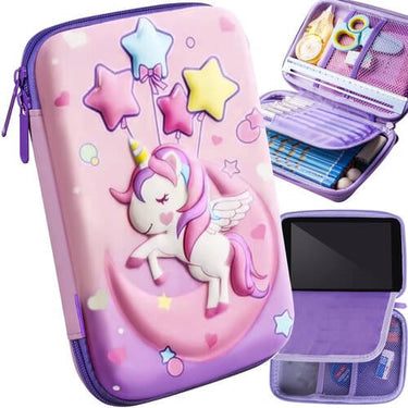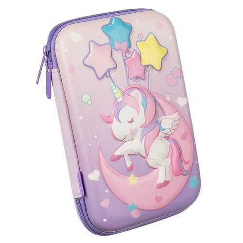 Enhörningspennfodral i 3D som kombinerar tydlig organisering med skyddande förvaring. EVA-skum ger en lätt men stötdämpande konstruktion som hjälper till att skydda pennor, sudd och andra småsaker i skolväska eller ryggsäck. Två rymliga fack och dubbel dragkedja gör det enkelt att separera innehåll och komma åt rätt saker snabbt. Formatet fungerar även för mindre tillbehör som laddkabel, miniräknare eller en liten surfplatta. Kan också användas som sminkväska, bordsorganisatör eller kompakt resekit.