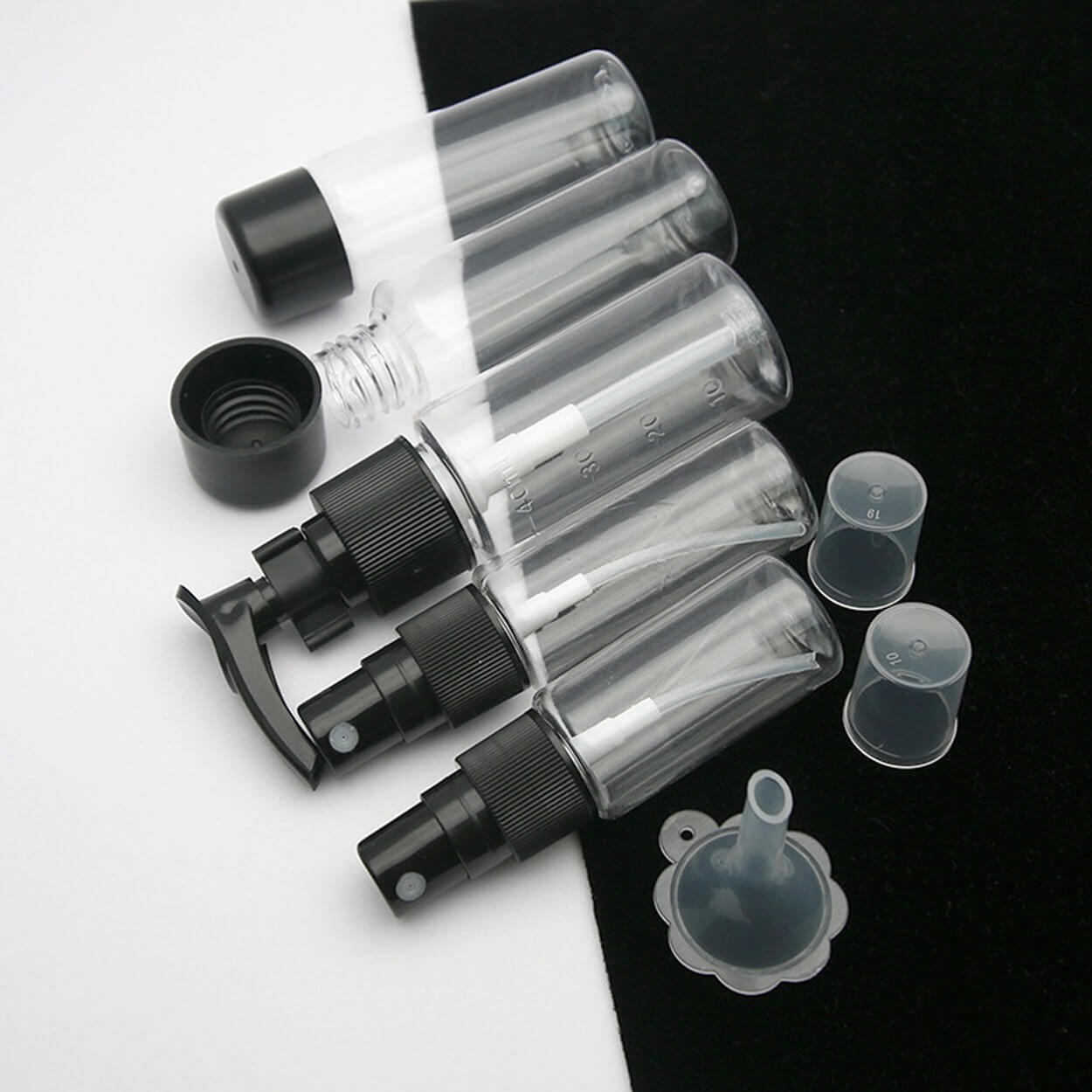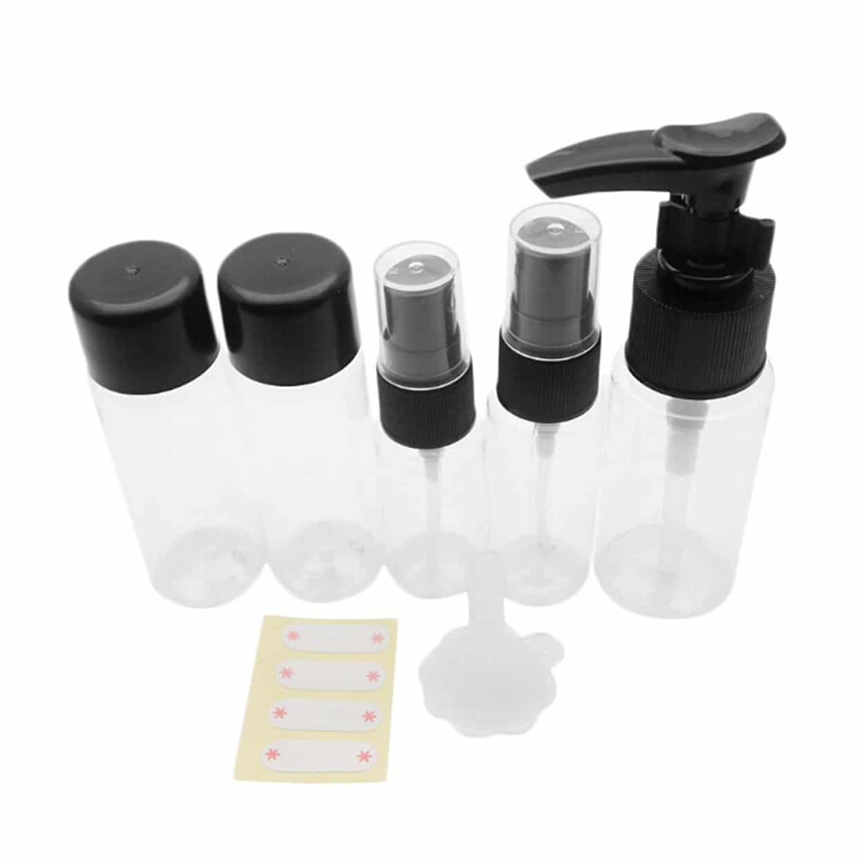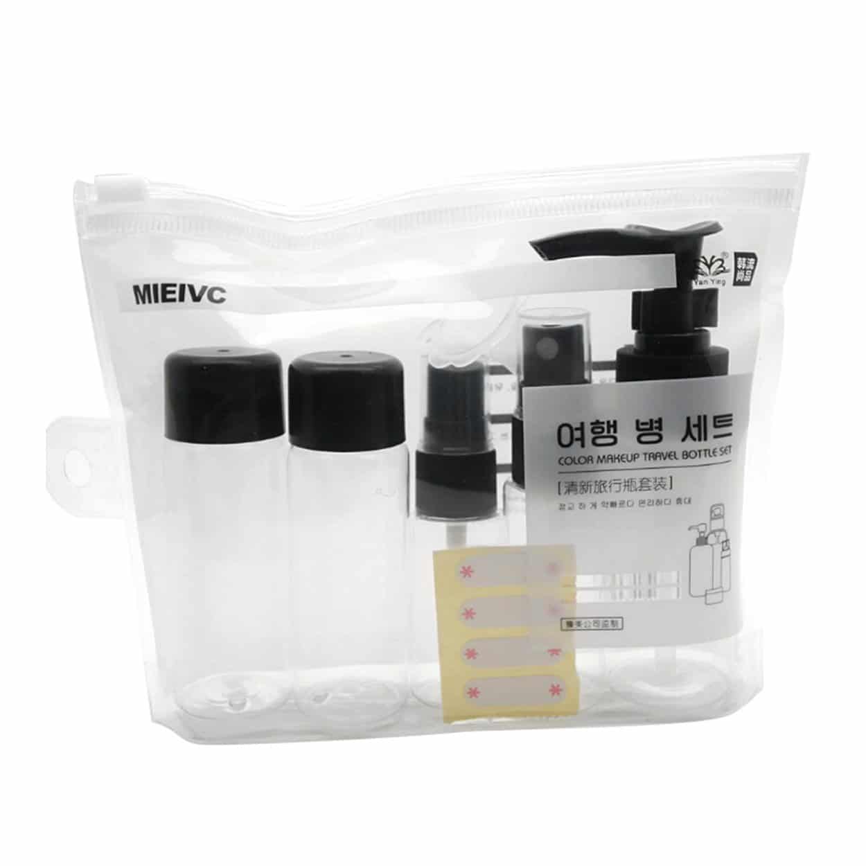 Resekit med fem genomskinliga behållare som fylls med egna vätskor inför resan. Passar för exempelvis schampo, hudlotion och parfym och gör det enklare att ta med favoritprodukterna i mindre format. Setet innehåller en pumpflaska för kräm, två sprayflaskor och två vanliga flaskor. Medföljande etiketter gör det lätt att märka upp innehållet så att rätt produkt används direkt, även när flera behållare ser likadana ut.