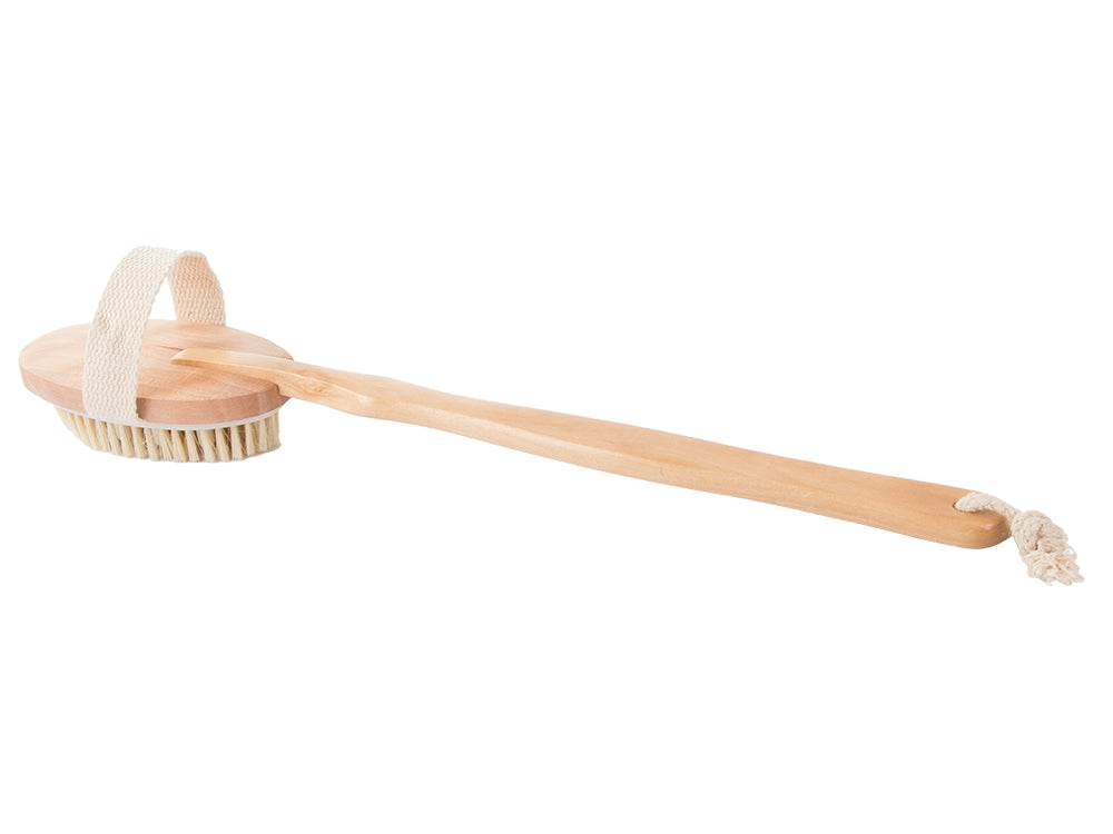 Ryggborste för torrborstning och bad som hjälper till att exfoliera huden och ge en mjukare känsla. Borsten tar bort döda hudceller utan peelingprodukter och kan även användas som en enkel helkroppsmassage, särskilt på ryggen där den är svår att nå. Regelbunden borstning kan stimulera blodcirkulationen och ge huden mer lyster. Använd på torr hud före dusch och borsta med långa, jämna drag. Undvik användning på irriterad eller skadad hud, samt vid eksem eller utslag.