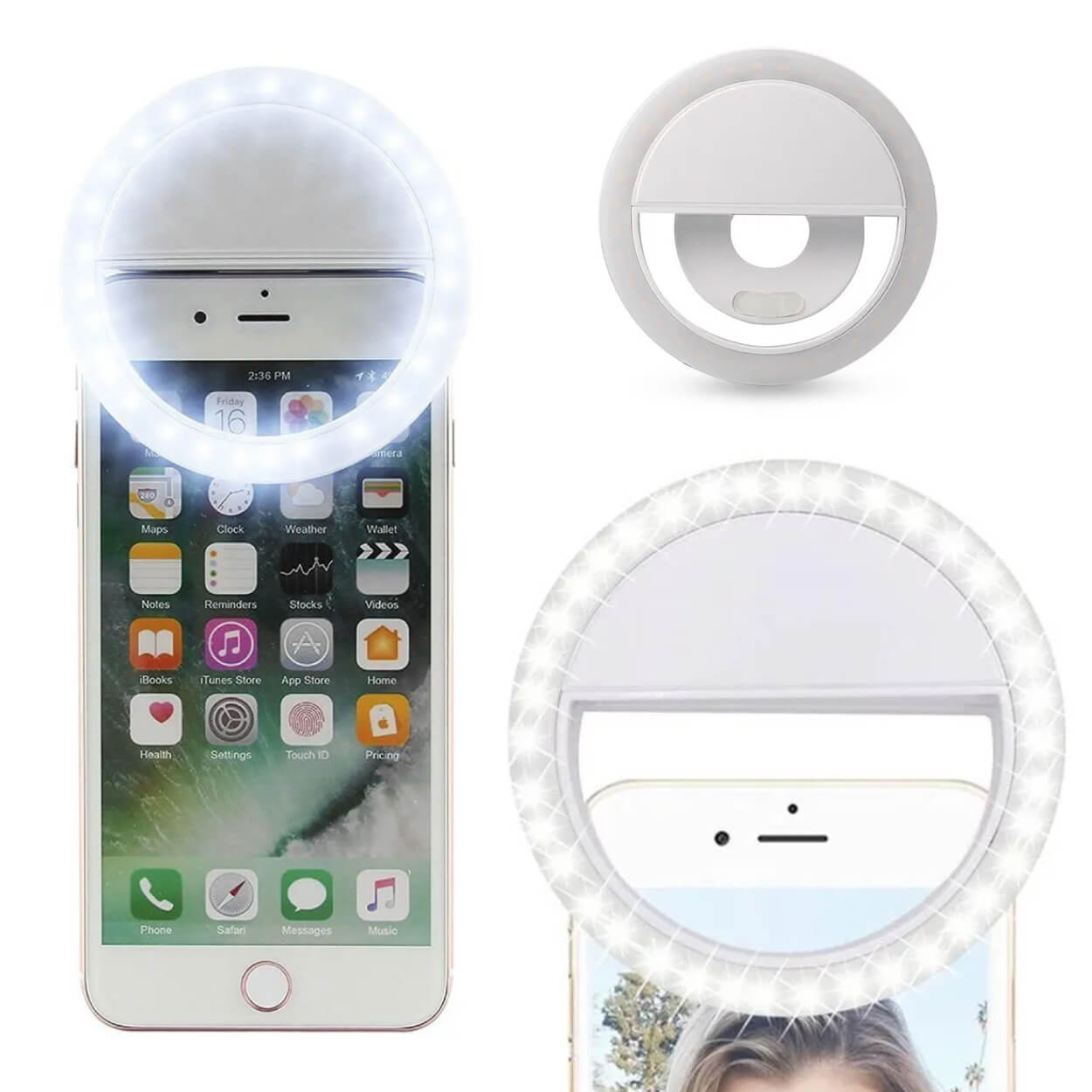 Clip-on selfielampa med LED-ringljus som ger jämn och balanserad belysning för foto och video. Lampan kläms fast direkt på smartphone och fungerar även på surfplatta och laptop, vilket gör den användbar för selfies, gruppbilder, vlogging och videosamtal i svagare ljus. Det kompakta formatet gör den enkel att bära med sig och snabb att montera när ljuset behöver förbättras. Uppladdning sker via micro USB och kabel medföljer för smidig användning hemma eller på resa.