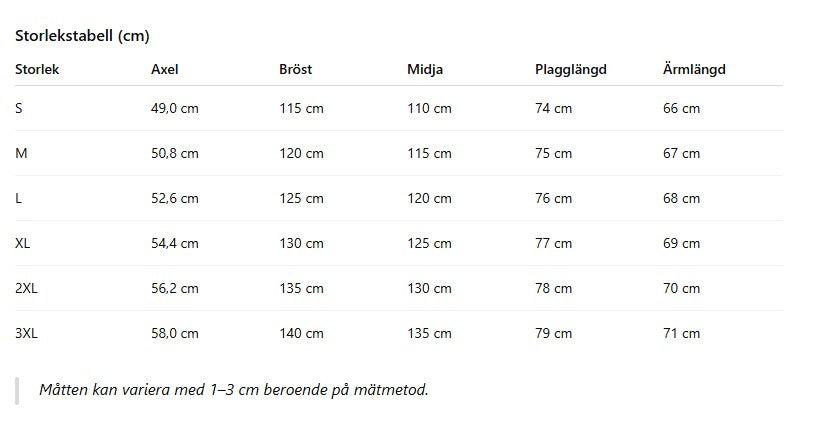 Storlekar finns från S till 3XL, vilket gör det enklare att hitta en passform för olika kroppstyper. För bästa funktion som lagerplagg kan en något rymligare storlek ge plats för en tjockare tröja under.