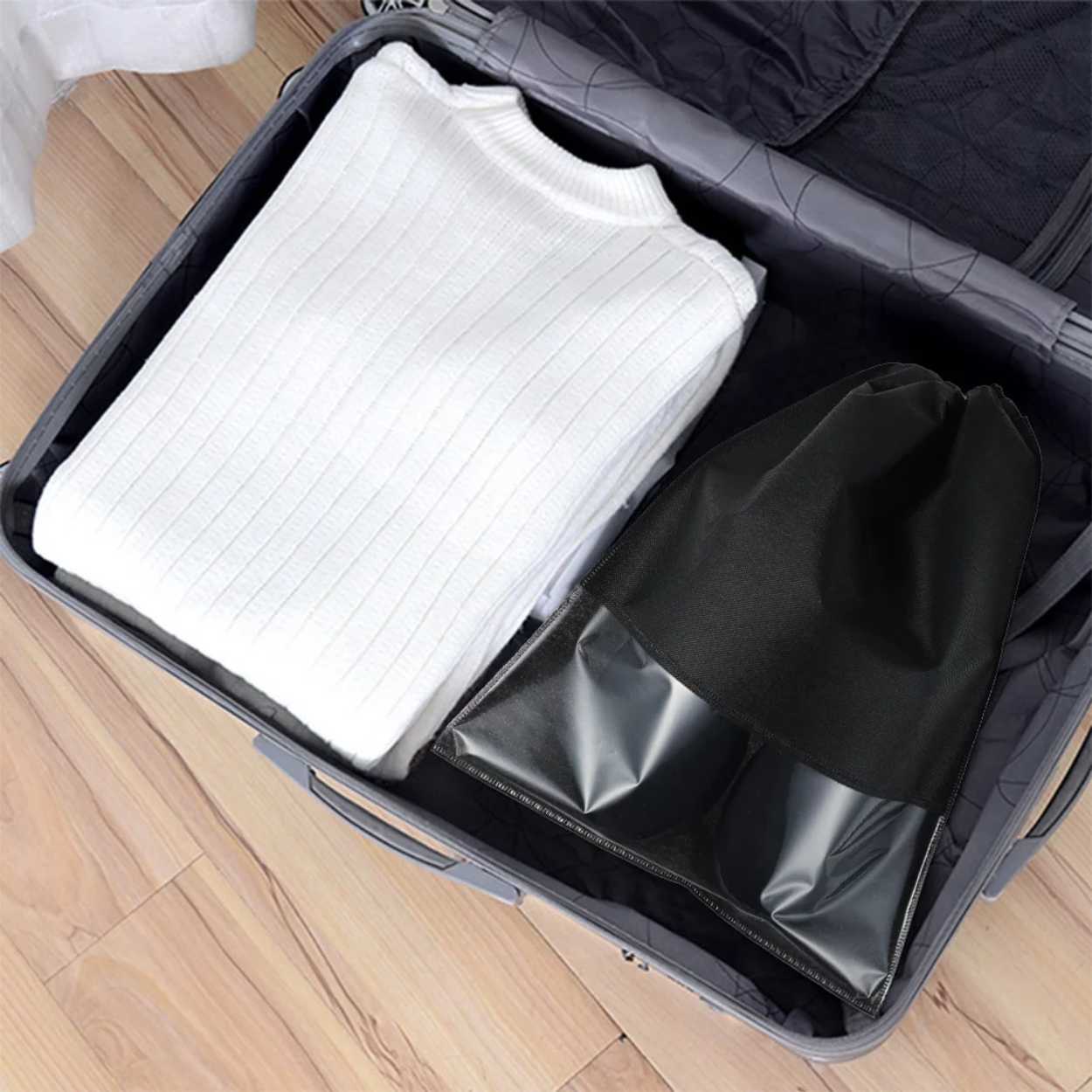 Skopåse med transparent fönster som gör det enkelt att se vilka skor som ligger i påsen utan att öppna. Ovävt tyg ger ett slitstarkt skydd mot damm och smuts och hjälper till att hålla skor separerade från kläder i resväskan eller i garderoben. Formatet passar många typer av vardagsskor, inklusive sneakers i normalstorlek. En praktisk lösning för ordnad förvaring och smidigare packning.