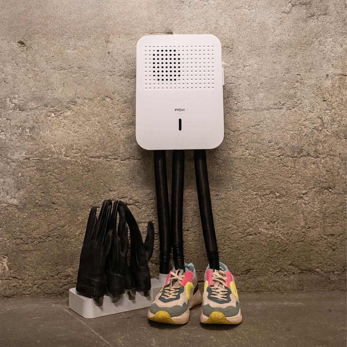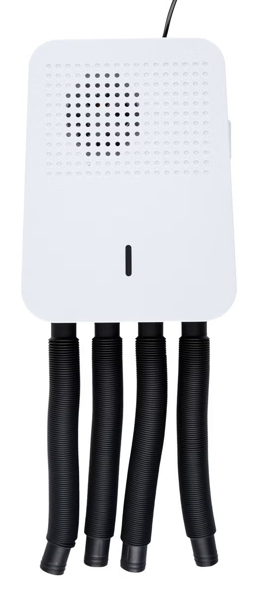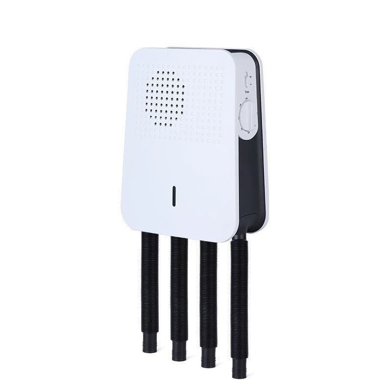 Väggmonterad skotork med slangar som leder varmluft in i skorna för snabb och skonsam torkning. PTC-värmeelementet ger stabil temperatur och två värmelägen låter dig välja cirka 35–55 °C beroende på material och behov. Inbyggd timer upp till 180 minuter stänger av automatiskt, vilket gör användningen trygg och energieffektiv. Kapaciteten räcker för ett par skor samt två par handskar samtidigt, vilket passar bra i hall, groventré eller förråd när utrustning behöver torka mellan användningarna.
