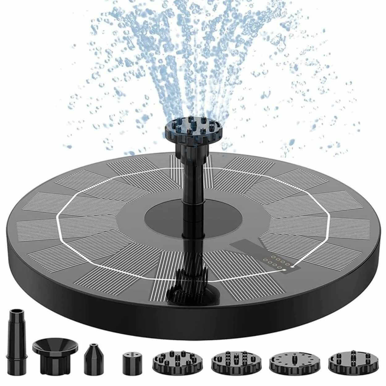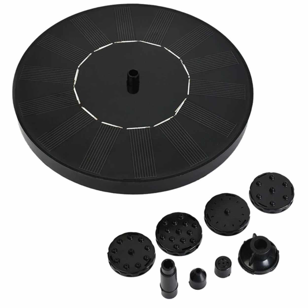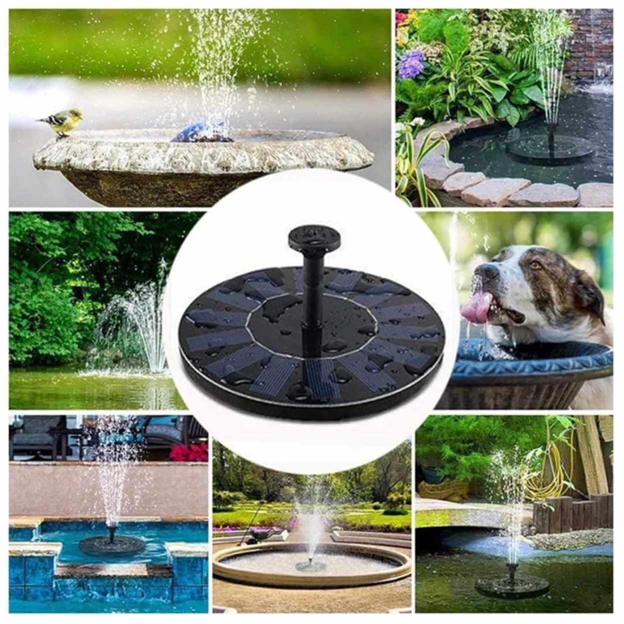 Solcellsfontän för fågelbad, damm eller pool som drivs helt av solenergi. Fontänen placeras flytande på vattenytan och startar automatiskt när solpanelen får tillräckligt med solljus, normalt inom 3 sekunder. Med flera munstycken kan vattenstrålen varieras för olika vattenmönster och strålbilder. Sprayhöjden ligger cirka 35–65 cm beroende på valt munstycke och solstyrka. Mjuka vattenstrålar gör den lämplig som vattenkälla för både fåglar och husdjur, utan behov av kablar eller batterier.