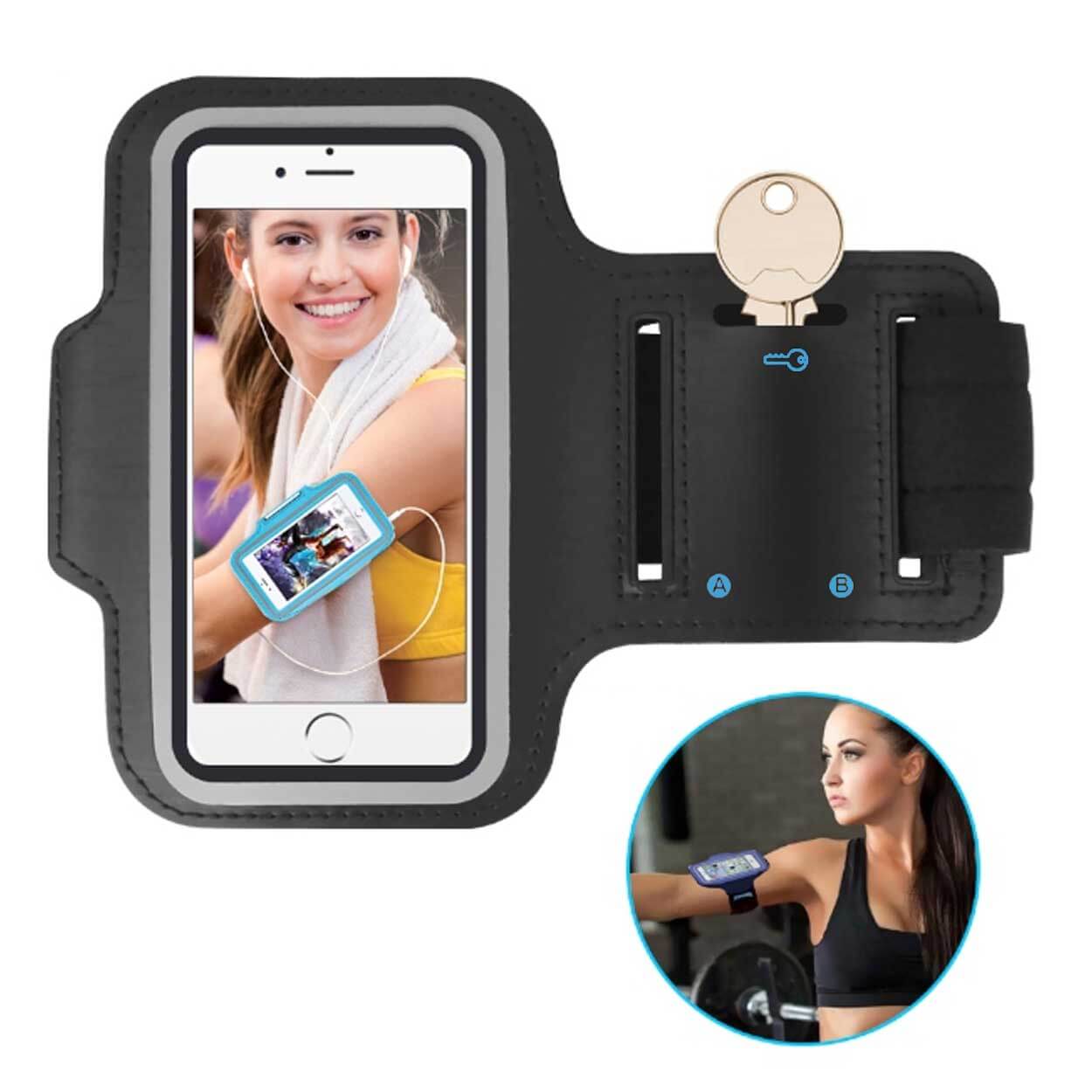 Universellt sportarmband som håller mobilen säkert på armen under träning. Passar de flesta smartphones upp till 4,7 tum och är tillverkat i mjukt neopren som sitter bekvämt och tål aktiv användning. Genomskinligt fönster ger åtkomst till skärmen så att funktioner kan användas utan att ta ur telefonen. Reflexkant ökar synligheten vid löpning i mörker. Kardborreknäppning gör storleken enkel att justera. Inbyggt nyckelfack minskar behovet av fickor och hörlurshål gör det smidigt att lyssna under passet.