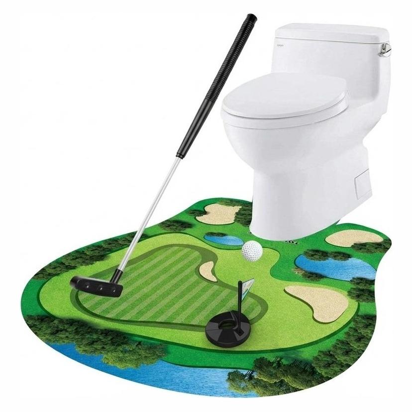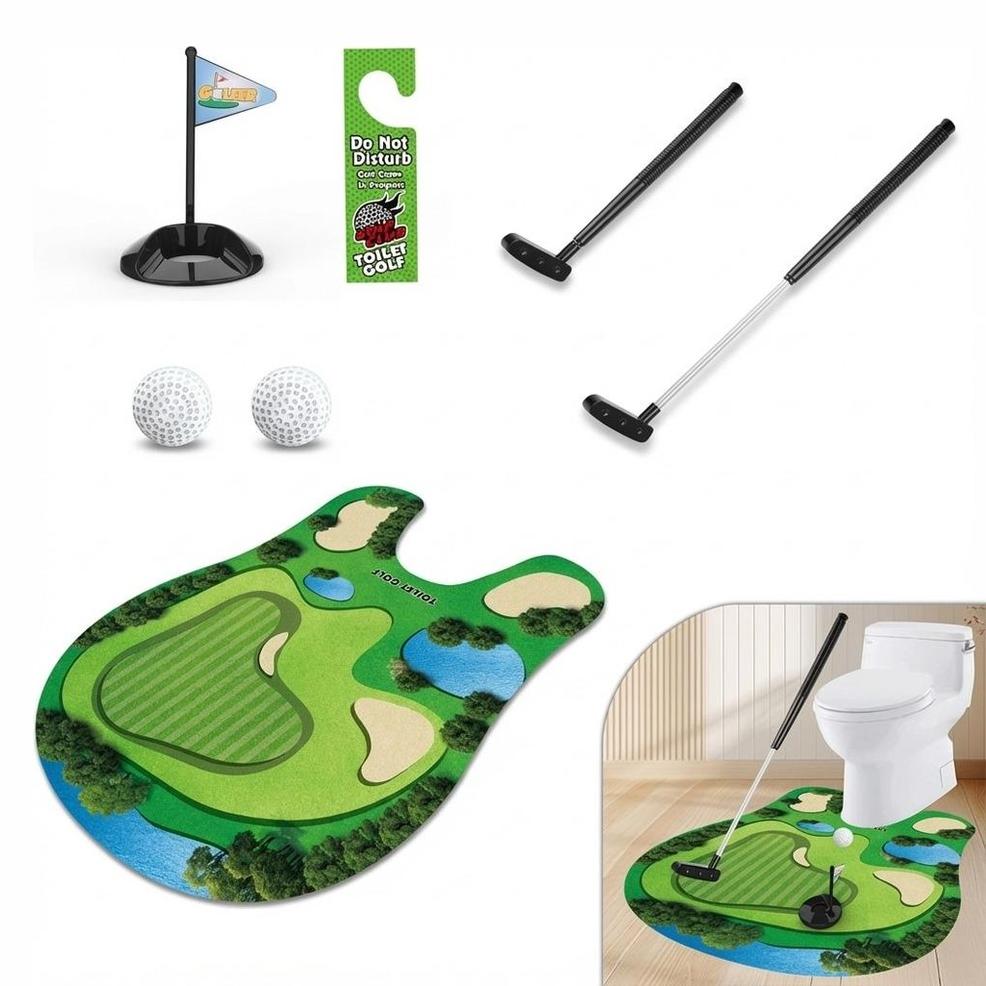 Toalettgolf är ett mini-putting set för badrum och andra små ytor inomhus. Puttingmattan är formskuren för att kunna placeras runt toalettens bas och ger en tydlig yta att putta på. I setet ingår även en mini-putter, två bollar och en hålflagga med bas som markerar målet. Passar för korta puttingutmaningar och enkel träning av precision och hand-öga-koordination. Delarna är lätta att plocka fram, flytta och ställa undan när de inte används.