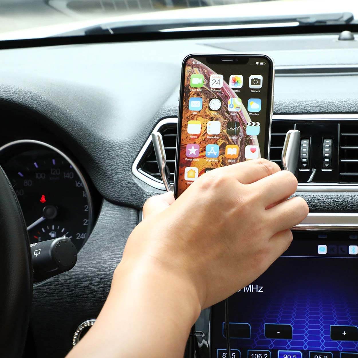 Trådlös billaddare som kombinerar mobilhållare och Qi-laddning i samma enhet. Sensorstyrda armar klämmer automatiskt fast telefonen när den placeras i hållaren, vilket ger stabil montering och snabb åtkomst under körning. Laddningen sker utan kabel och stödjer upp till 10 W trådlös snabbladdning för kompatibla telefoner. Passar för musik, samtal och navigation när mobilen behöver vara synlig och samtidigt laddas. Inbyggt överladdningsskydd bidrar till tryggare laddning i bilen.