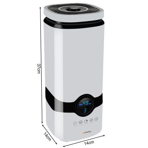 Ultraljudsluftfuktare som kombinerar aromadiffuser och jonisering för en mer behaglig inomhusmiljö. Den stora vattentanken på 4 liter ger lång drift, och kapaciteten på upp till 250 ml/h hjälper till att hålla en jämn luftfuktighet i rum upp till 20 m². Inbyggd hygrometer ger bättre kontroll, medan timer, nattläge och automatisk avstängning förenklar säker användning. Styrning sker via pekskärm eller medföljande fjärrkontroll. Tre doftoljor ingår för aromaterapi vid behov.
