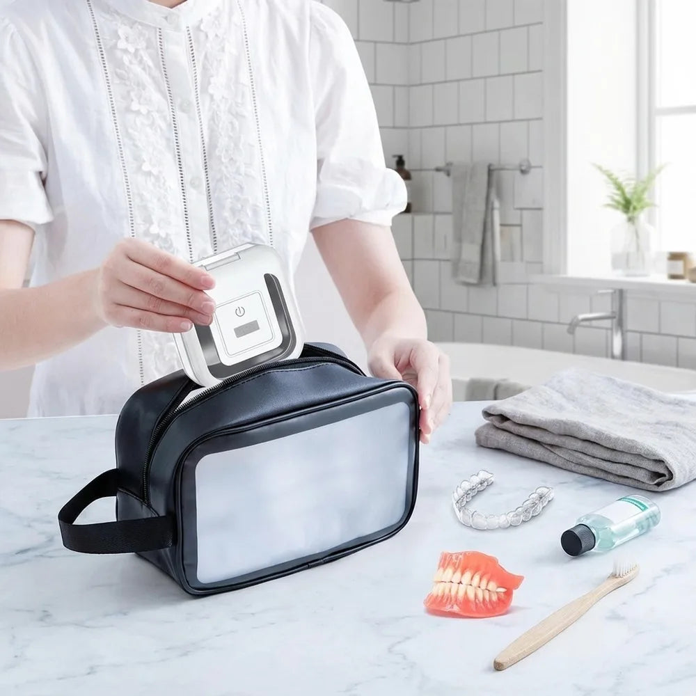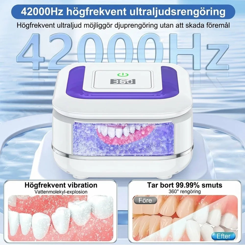 Ultraljudsrengörare för proteser och andra små munhjälpmedel som bettskenor och tandställningsdelar. Rengöringen sker i en liten vattentank där ultraljudsvibrationer hjälper till att lossa beläggningar i svåråtkomliga ytor. Digital timer ger två valbara program på 180 eller 360 sekunder för snabb och kontrollerad rengöring. Formatet är kompakt för placering på handfat eller för att ta med på resa. Levereras med nätadapter för strömförsörjning.