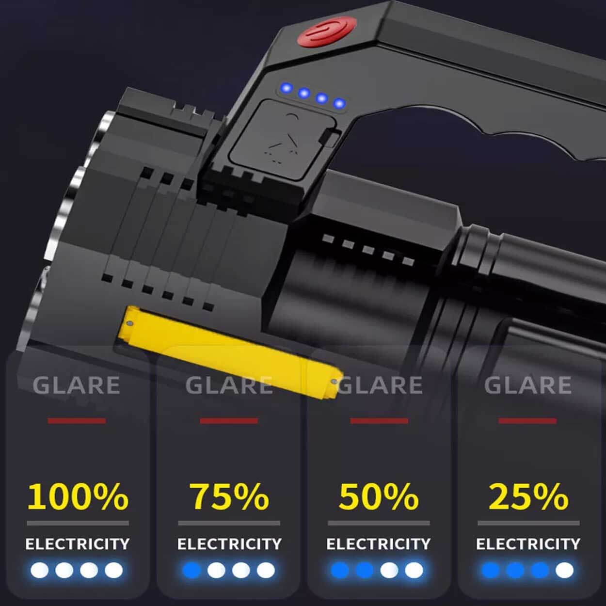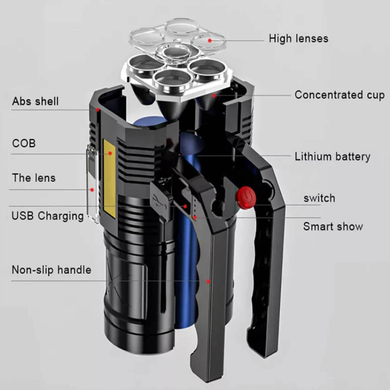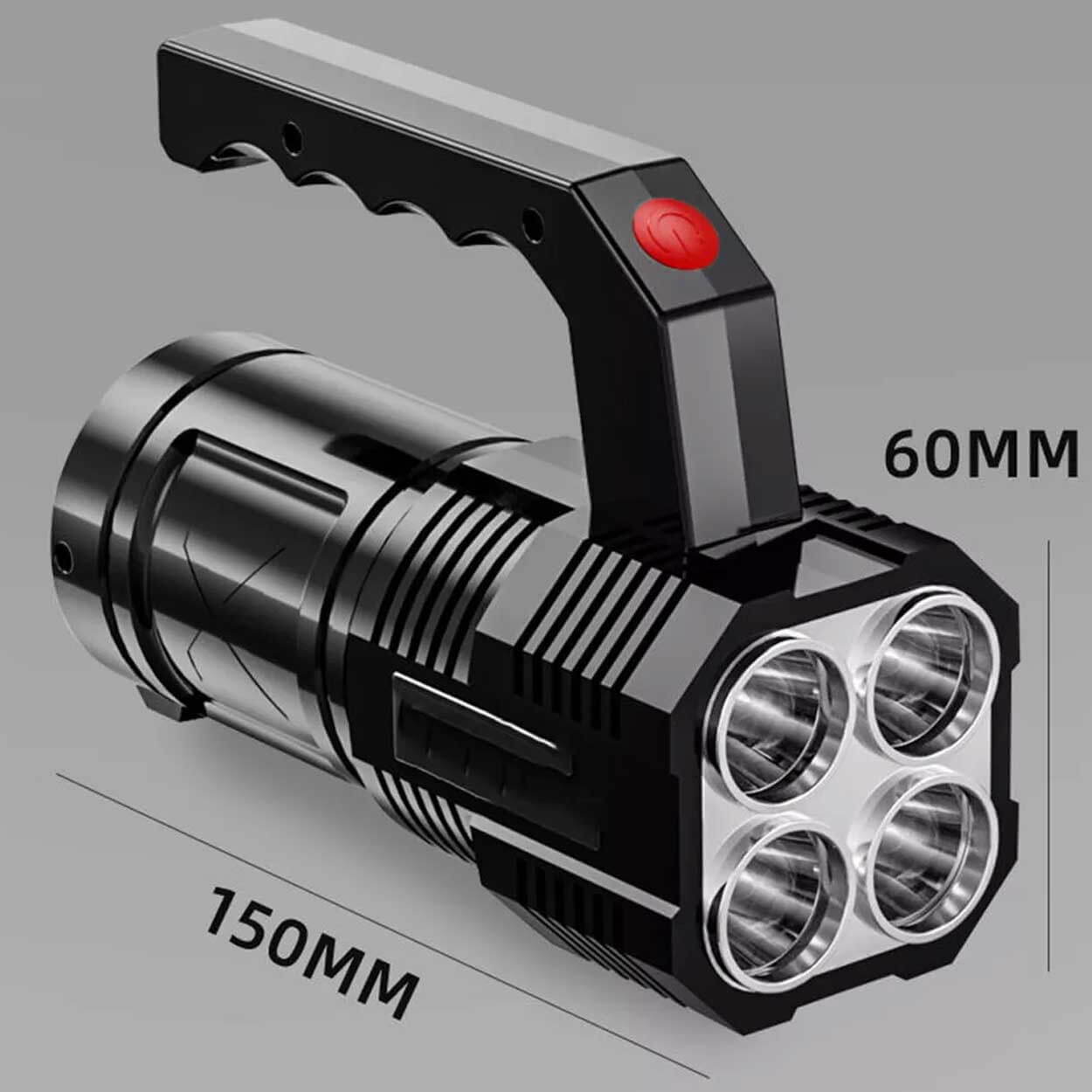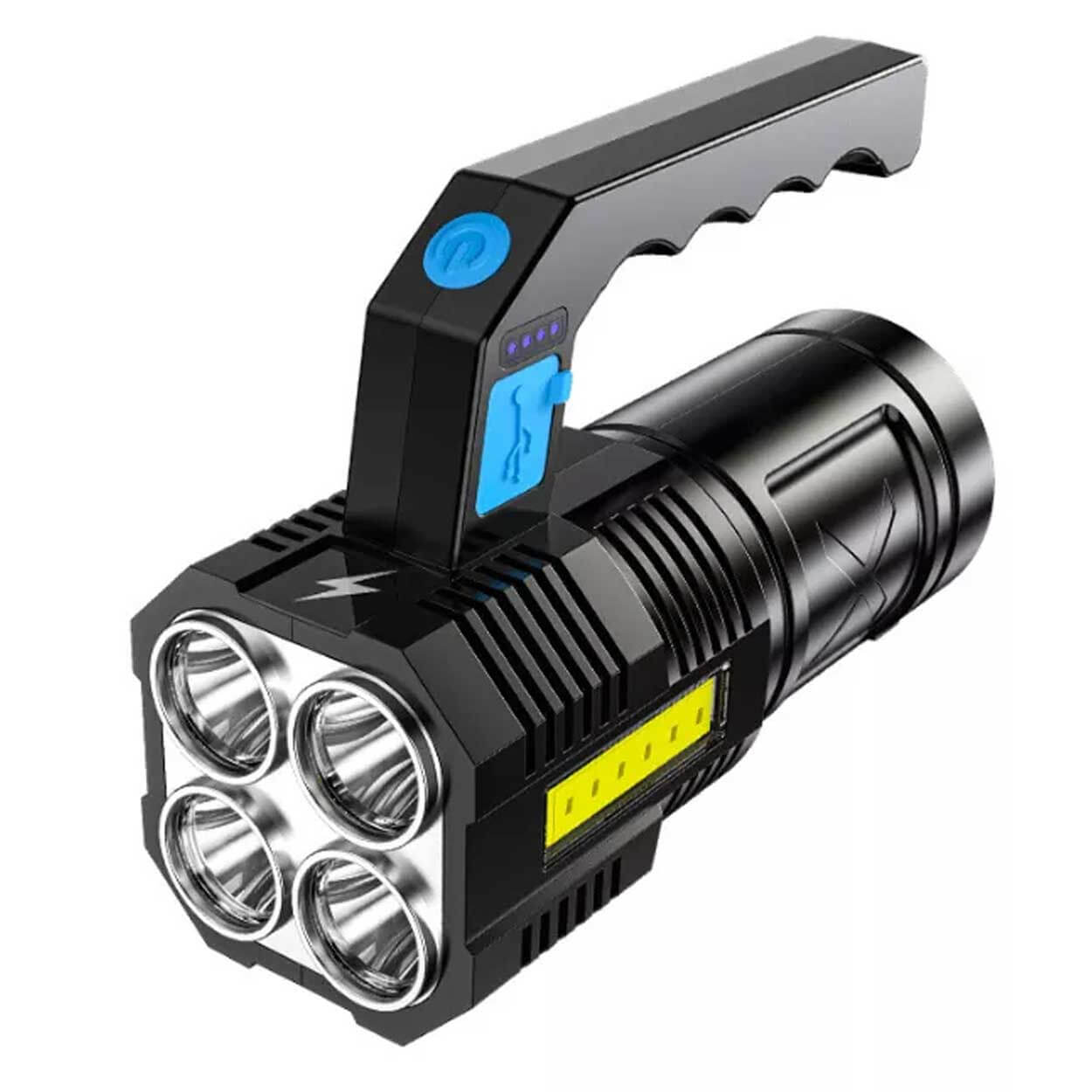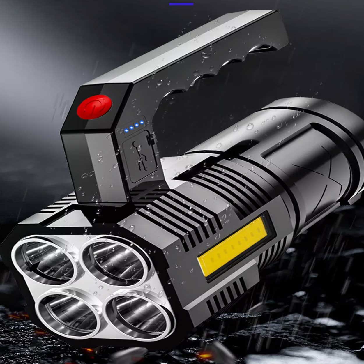 Uppladdningsbar LED-ficklampa med handtag för arbete, friluftsliv och nödsituationer. Ljusstyrkan på 300 lumen ger upp till 200 meters räckvidd och fyra lägen gör det enkelt att växla mellan hög, låg, SOS och COB-ljus för närarbete. Lampan drivs av ett uppladdningsbart 18650 litiumbatteri på 1200 mAh och laddas via micro-USB. Vattentålig konstruktion klarar regn och passar när du behöver pålitligt ljus vid strömavbrott eller utomhus i mörker.