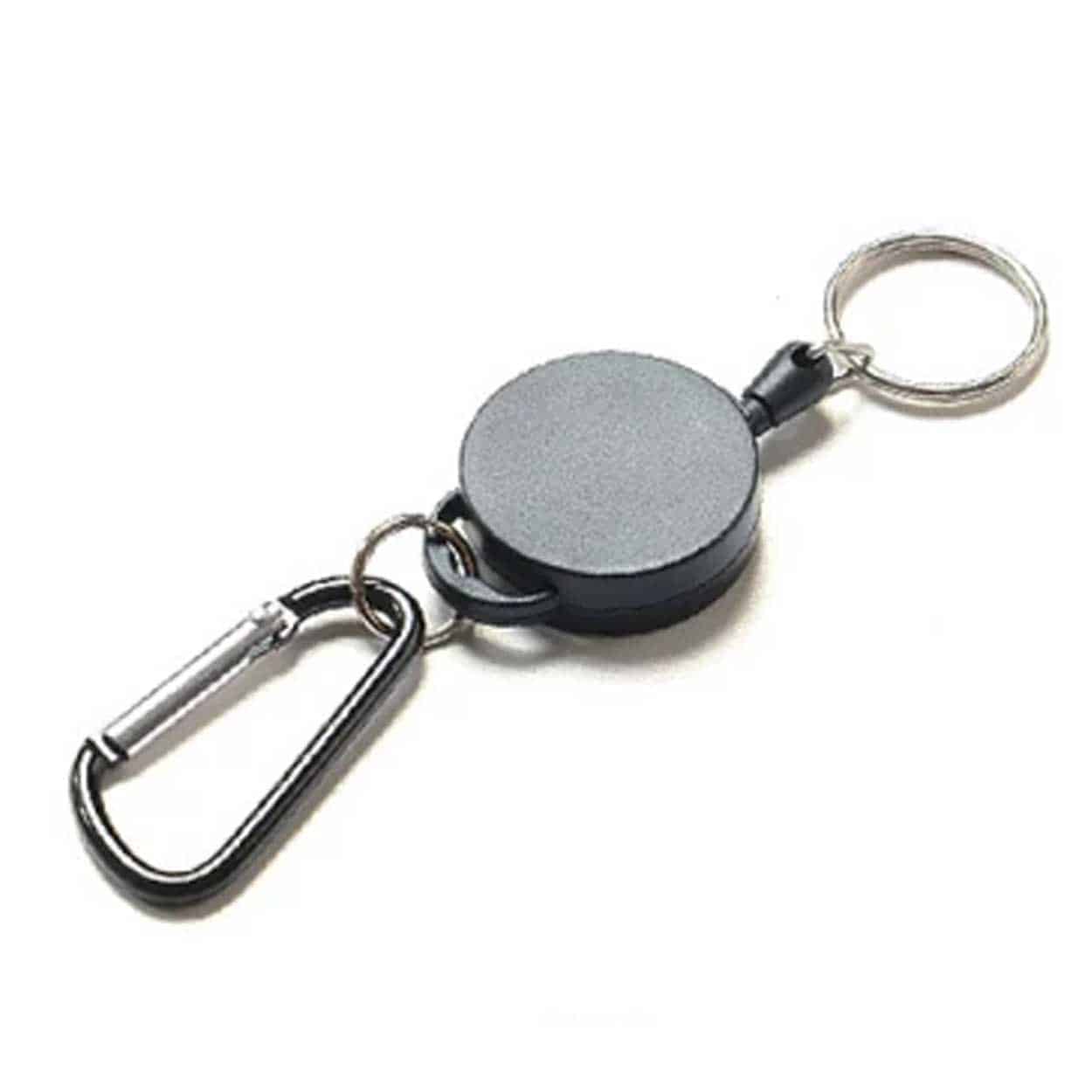 Passar bra vid passerkort och nycklar som används flera gånger per dag. Fäst karbinhaken i bälte eller ögla, dra ut snöret vid användning och låt det rulla tillbaka för att hålla nycklarna nära kroppen.