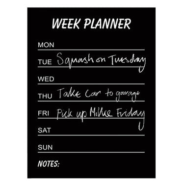 Veckoplanerare i form av en självhäftande griffeltavla som fästs direkt på väggen. Ger en tydlig översikt över veckan och gör det enkelt att skriva upp matplanering, aktiviteter och viktiga påminnelser. Griffelytan kan skrivas på och suddas av löpande, vilket gör att planeringen snabbt kan uppdateras utan papper. Passar bra i kök, hall eller hemmakontor och fungerar även som en praktisk rityta för barn.